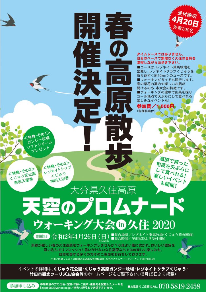 春の高原散歩開催決定! 開催日:4月26日(日) 天空のプロムナードin 久住 2020 大分県竹田市の久住山の麓を走る 県道669号「阿蘇くじゅう公園線」は 絶景ビューが自慢のドライブコース。 歩道には芝生が貼られていて、 ウォーキングには最適なコースです。 ガイドが久住を案内してくれて、 さらに嬉しい特典つき!! お申し込みは下記PDF/ 阿蘇くじゅう国立線芝歩道管理協議会まで 天空のプロムナード P D F ダウンロード ・ ・