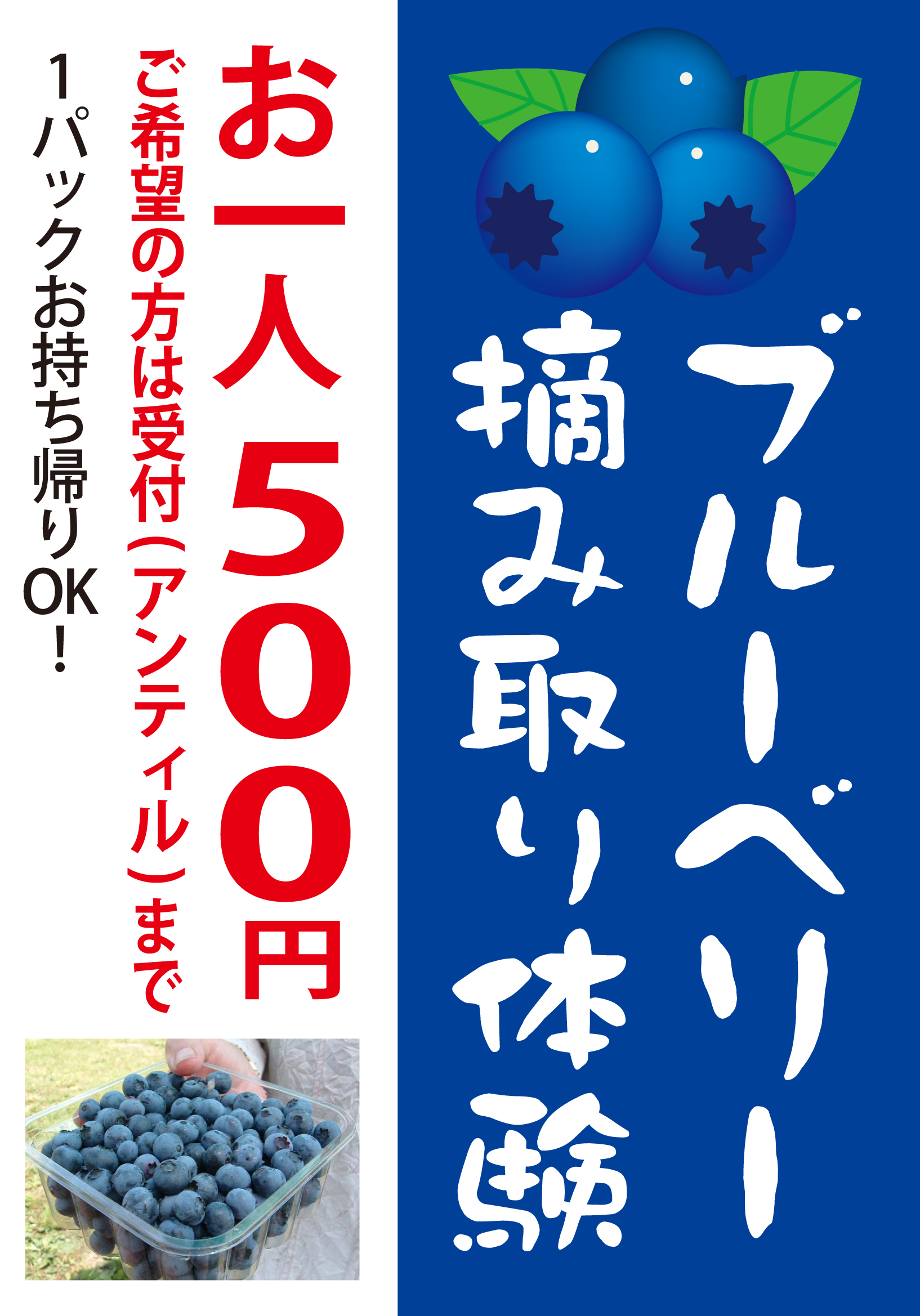 予約不要・ブルーベリー摘み取り体験スタート!! ■期間:7月1日(土)~8月中旬頃まで 久住高原の恵みブルーベリーの季節となりました。 11種類・約2000本のブルーベリーが実ります。 体験料金 / おひとり 500円 指定のパックに入るだけ摘み取ることができます。 ※荒天時や台風通過後、一時中止となる場合がございます。