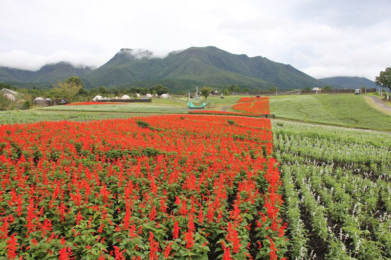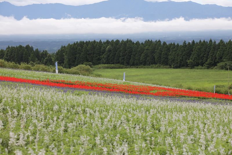 一足早く真っ赤なサルビアが彩っています。 まるで、赤い絨毯のようです!! この秋園内で最も広い花畑「高原の彩り」エリアに、 約6万株のサルビアが登場します。 ・ また、ホワイトサルビアやブルーサルビアもゆっくりと咲き始めています。 3色のコントラストが美しい、秋の絶景が楽しめそうですね。 見頃予定は9月中旬頃予定。