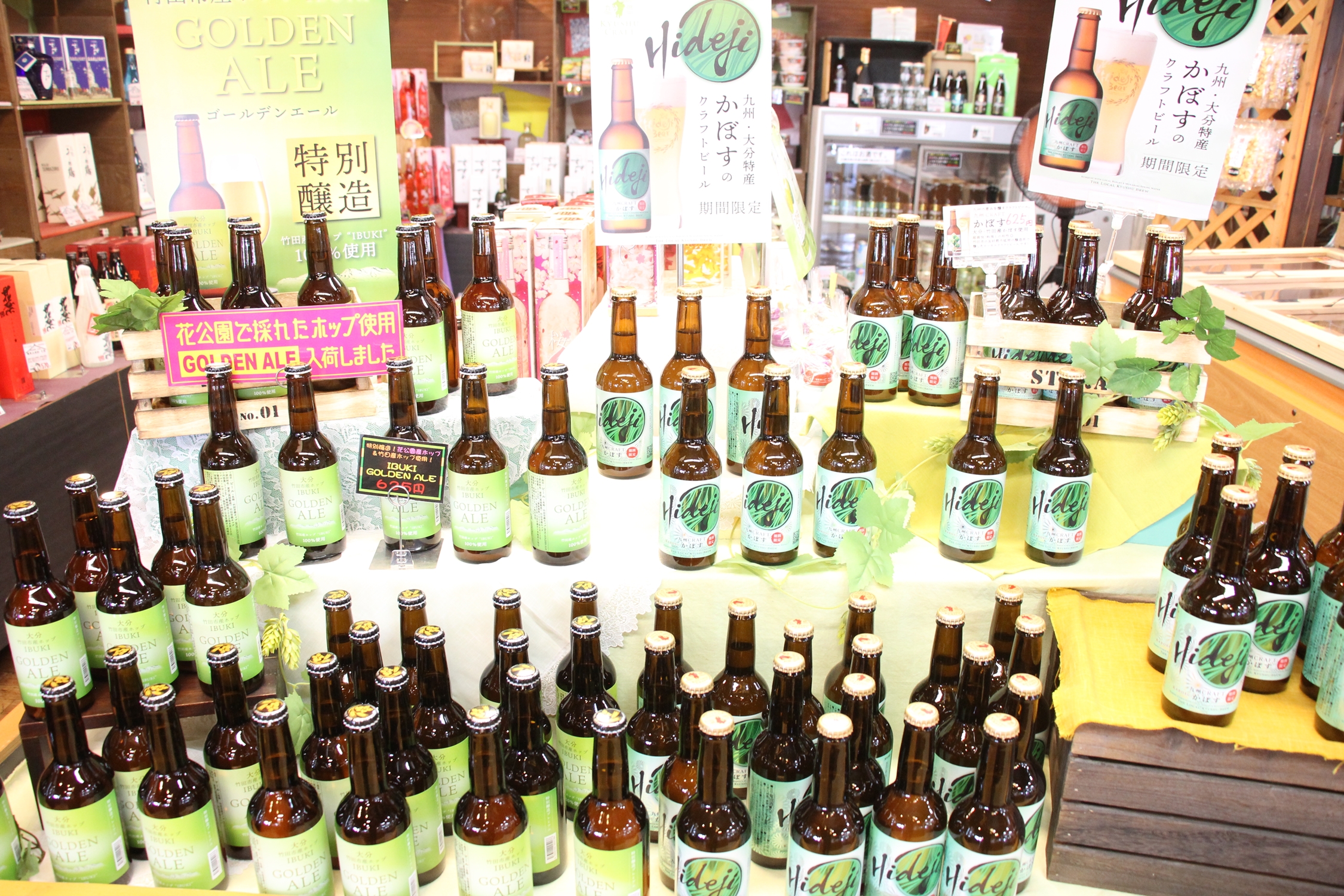 冷えたビールが美味しい季節となりました。 標高850mのくじゅう花公園で採れた、 香り豊なホップを使用したゴールデンエールと 九州・大分県産かぼすのクラフトビール。 どちらも人気商品です。 その他にもクラフトビール多数取り揃えています。 お土産総合ショップ「花の駅」にて販売中!! ぜひ、お立ち寄りください。