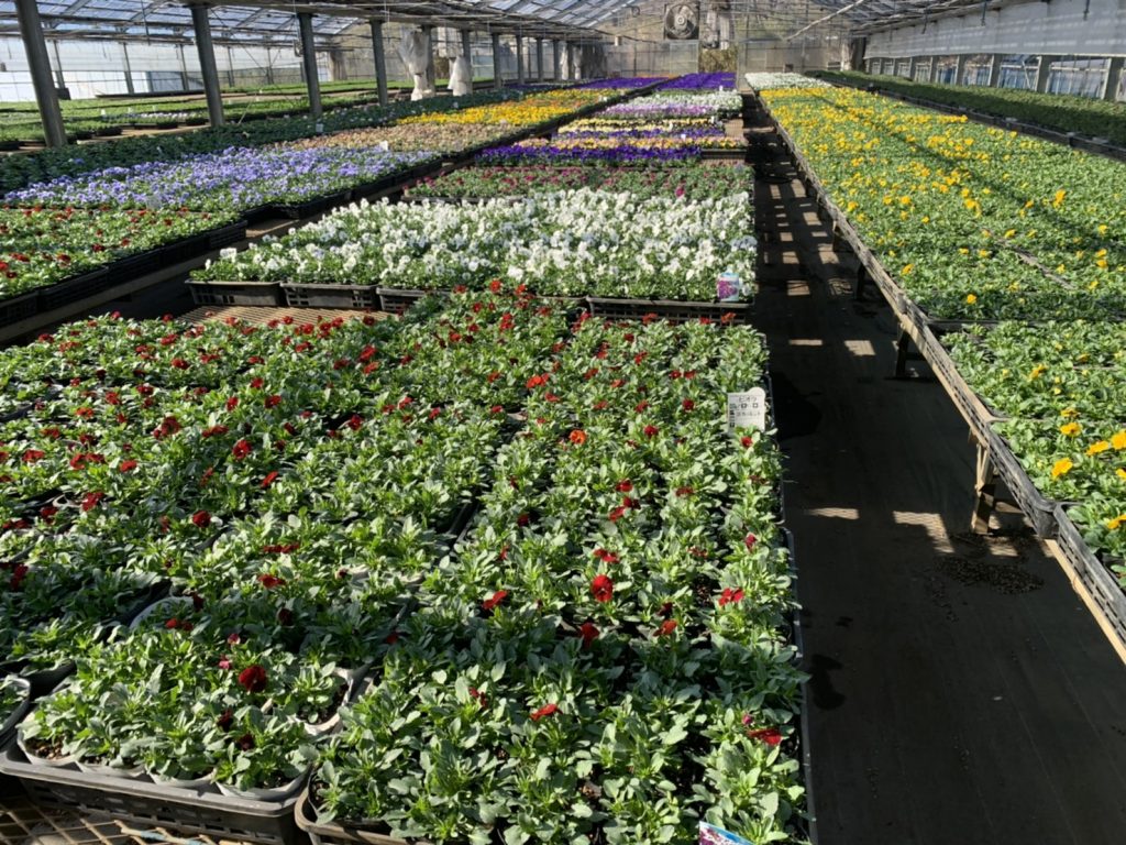 温室に差し込む日差しが、ほっこりとあたたかい** 今日は花苗生産センターの様子です。 畑へのデビューを待つ、 花盛りの苗たちが、ズラリと並びます。 小さな春をみつけるけるだけで、 なんだか幸せな気分になりますねっ** 赤・白・青・黄のカラフルなビオラは、 4月頃から見頃を迎えます** 春になったら、小さな幸せを探しに来ませんか**