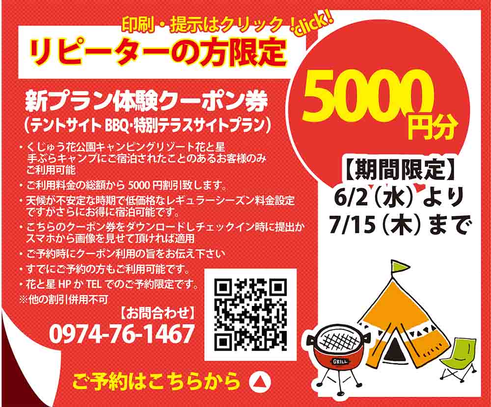 【お知らせ】キャンピングリゾート 花と星 期間限定 特別体験クーポン券発行!