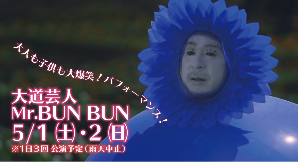 ・ TV CM動画に出演中の青い妖精さんは、 大分県出身の大道芸人 Mr. BUN BUN さんです。 この春くじゅう花公園へやってきます(予定)!! ※開催スケジュールが変更になる場合がございます。 ↓ ↓
