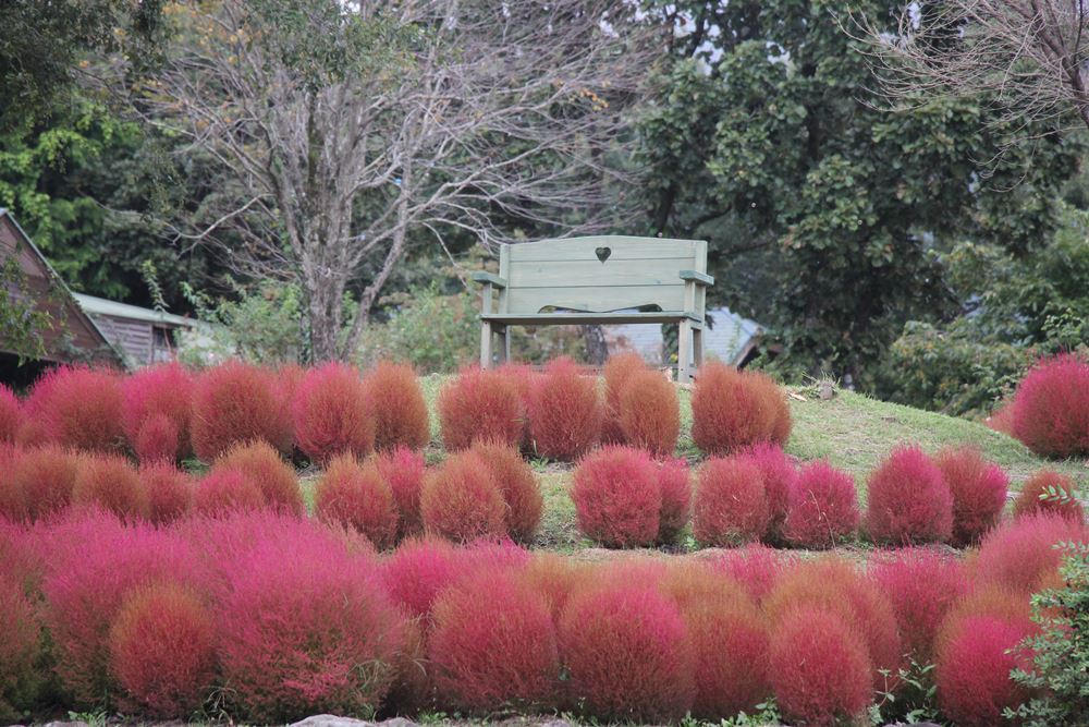 赤く染まるコキアとハートのベンチ。 入園ゲート進んで目の前の小さな小高い丘にあります。 のんびり景色を眺めたり、景色を楽しむのもおすすめ。 秋の陽気に包まれて、癒しの時間を過ごしませんか。