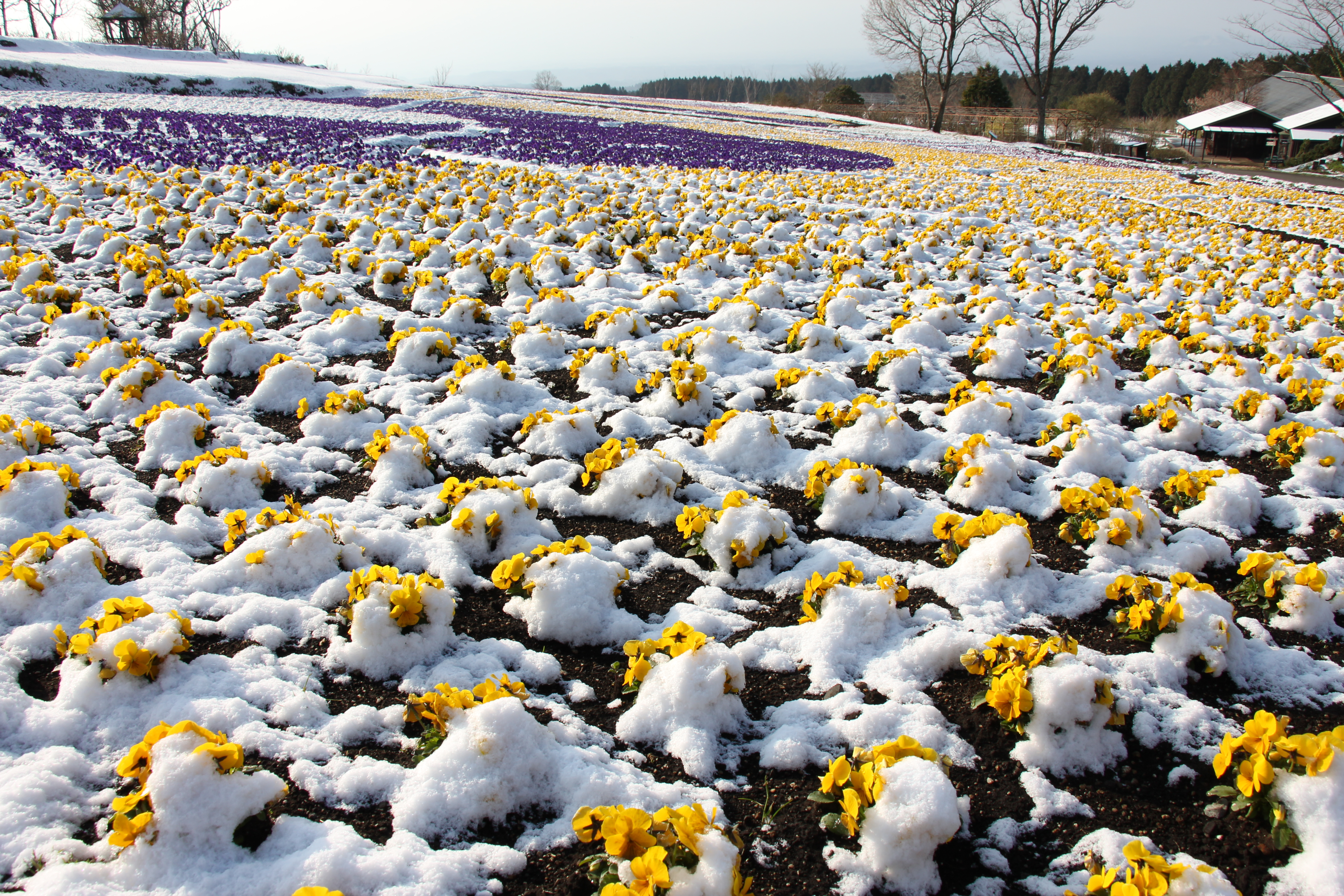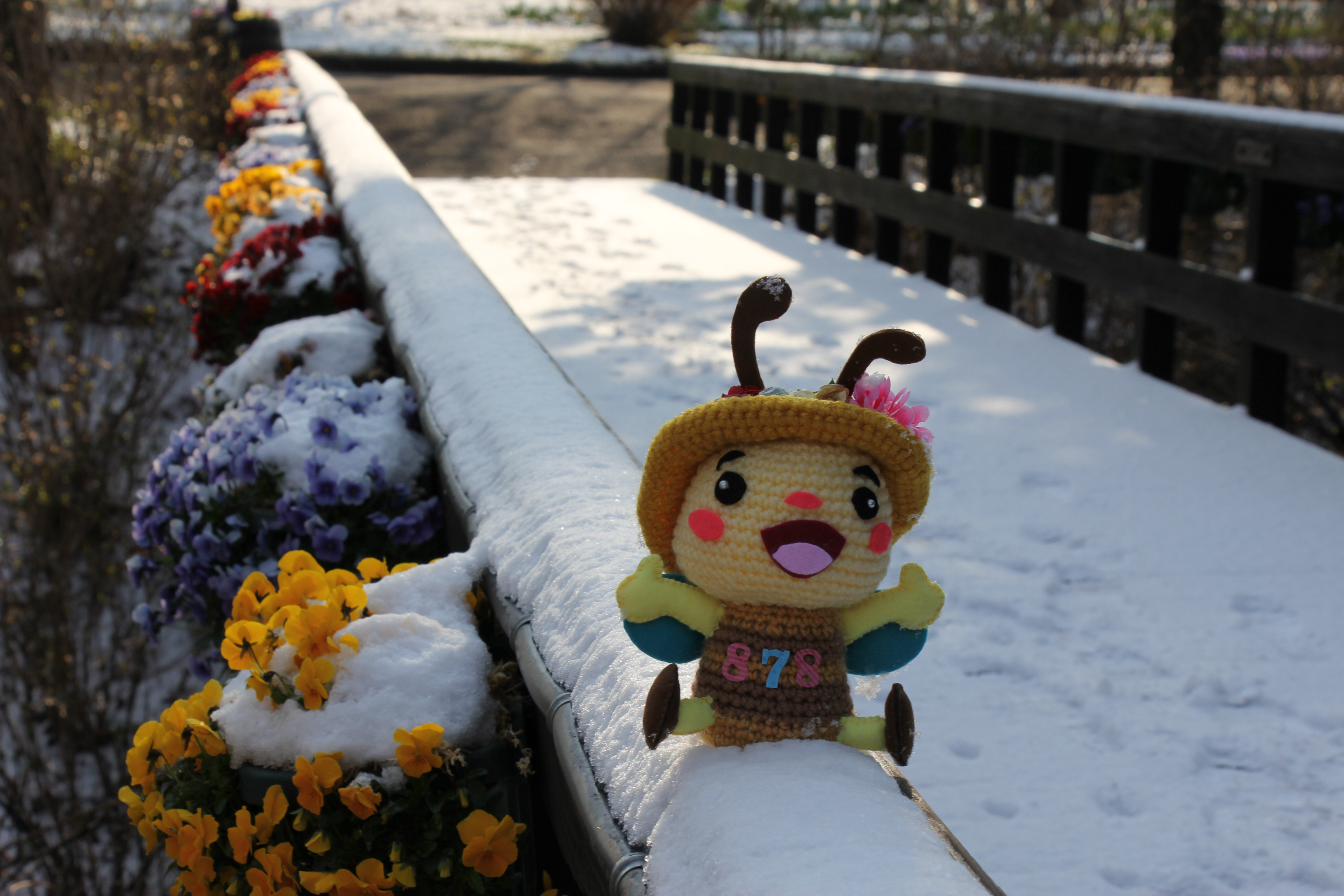 ・ みなさんこんにちは~♫ 久住高原には雪が積もり、幻想的な景色が広がりました~ とっても、珍しい光景です。 くじゅう花公園の妖精さん 878くん もなんだか大喜び!! ↓ ↓ ・ お花の上にも雪が積もり、贅沢な時間も流れました。 ↓ ↓ ・