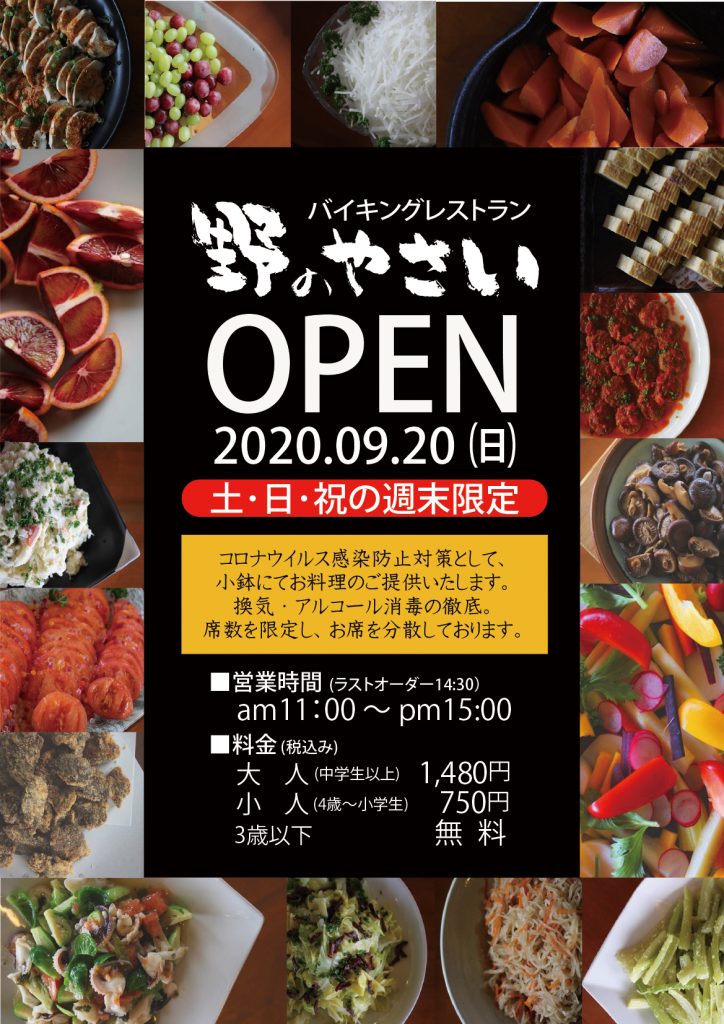 バイキングレストラン野のやさいよりお知らせ!! 2020.09.20(日)より、 土・日・祝の週末限定の営業が始まります。 コロナウイルス感染防止対策として、 小鉢にてお料理のご提供をいたします。 是非、ご利用ください。