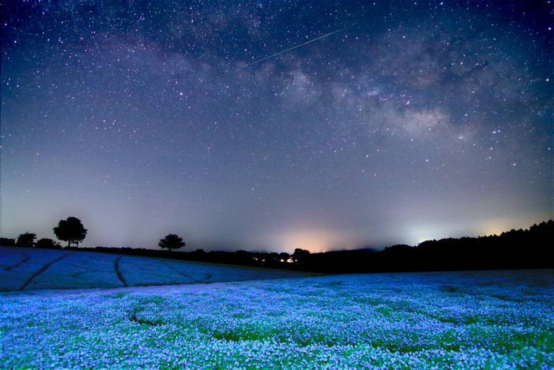 先日募集を行った星空撮影会、 沢山のご参加ありがとうございました** 天候や月・お花の条件が揃ったタイミングで、 開催させていただきます。 ▼ 先日撮影した夜のネモフィラ畑の様子です。