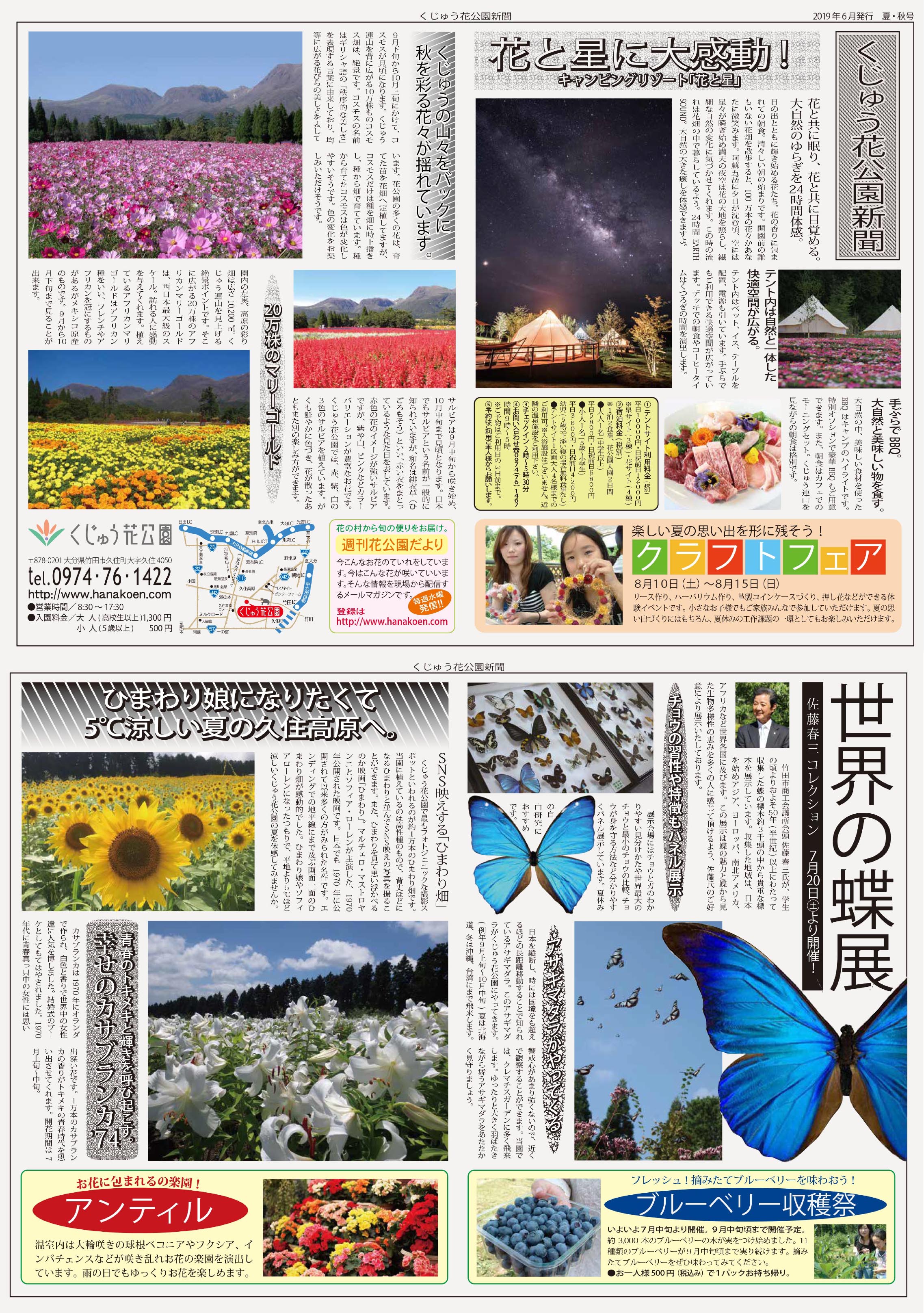 . 1日のうちで、 鳥や虫の鳴き声が聞こえたり、 綺麗な花が咲いていたりとか、 大自然の中では、 色々な事が起こっているんだけど、 . 自然に触れ合う事が、 少なくなっている子供たちに、 この夏久住高原の自然を 満喫していただきたいと思います。 ・ くじゅう花公園新聞にはイベント情報を掲載!! 画像をクリックすると、 拡大・PDFをダウンロードをすることができます。 / クリックすると拡大・PDFをダウンロードをすることができます。 /