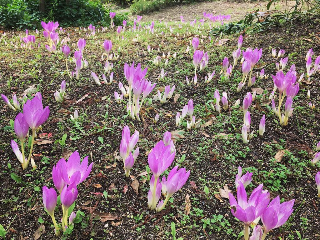 秋になると地面から、 にょきっと花を咲かせるコルチカム(イヌサフラン) 寄り添うように咲く花姿が愛らしく。 秋のガーデンを彩ってくれる球根植物です。 園内クレマチスガーデンで楽しむことができます。 どうぞ、お立ち寄りください。 ↓ ↓