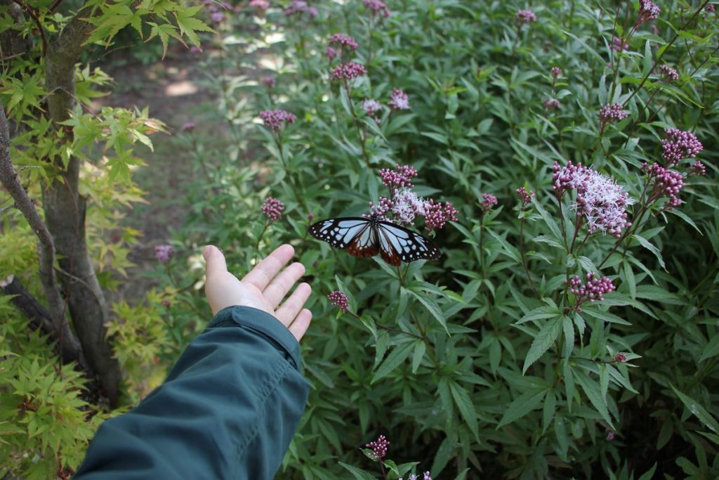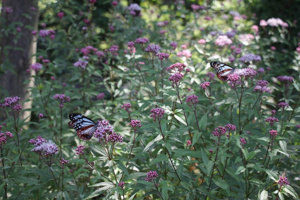 冬に備えて暖かい台湾へ向うアサギマダラが、 久住高原へ飛来しています。 その距離、千キロ以上も旅をするとか。 まだ、まだ、旅の途中。 やさしく見守ってあげてください♪** ↓ ↓ ・ 園内クレマチスガーデンでは、アサギマダラが休蜜する フジバカマを植えています。 ↓ ↓