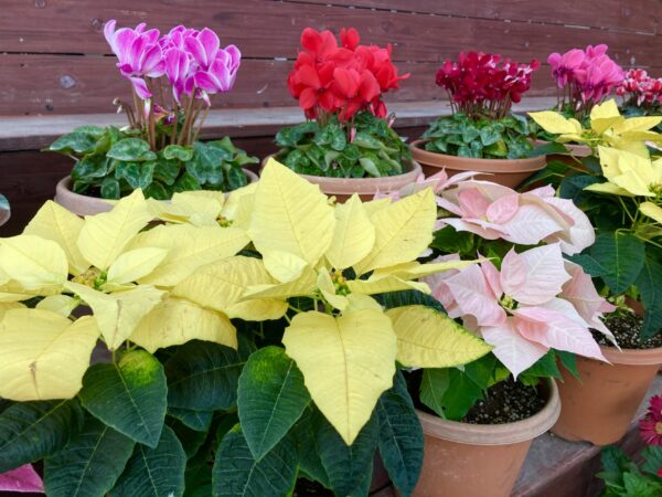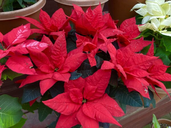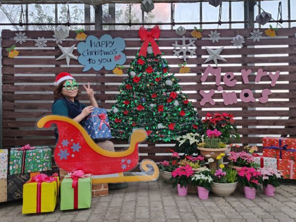 温室「アンティル」は写真スポットがたくさん!! ポンセチアやシクラメンを展示中です。 黄色やピンク、赤の色とりどりのポインセチア 赤のポインセチアはラメ入りでキラキラ クリスマスのオブジェで記念撮影はいかがですか?