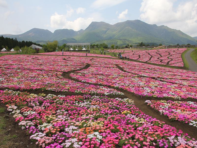 くじゅう連山の新緑がまぶしい季節となりました。 太陽の日差しを沢山浴びて光輝くのが、リビングストンデージー 現在 満 開 のご案内となっております ♪ * * 注:曇りや雨の日はお花が閉じている場合がございます。 ・