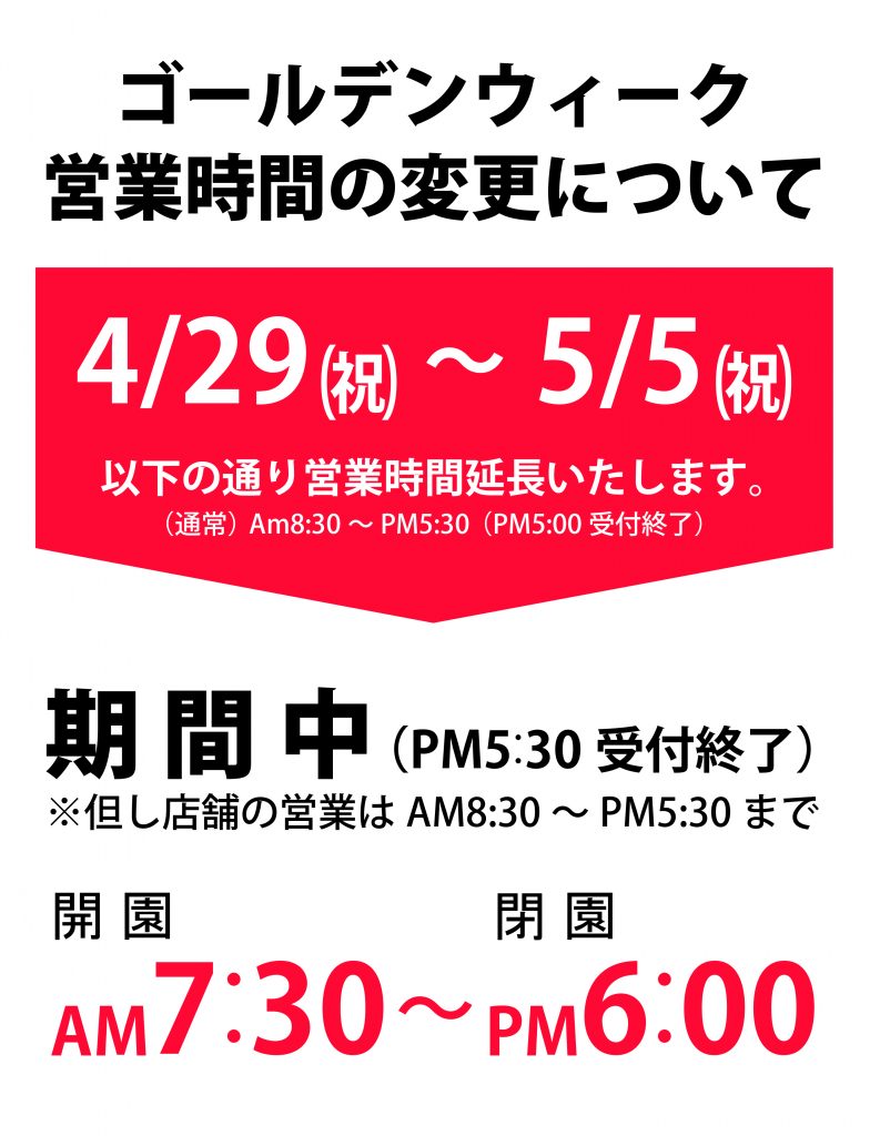 ゴールデンウィーク営業時間変更について 4/29(祝)~5/5(祝)