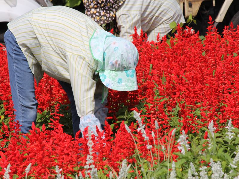 / 夜の気温も20℃以下となりました。 夏の終わりも少し、寂しいですが.....。 秋の澄んだ空気が心地よく、爽やか気分になります♪ ↓ ↓ ・ 今日はサルビア畑の草取り作業に入りました。 ↓ ↓ ・ 作業を進めていくと、、、、 ↓ ↓ ・ 徐々に花畑の表情も変わっていきます。 まもなく、見頃のご案内となりそうです!! ↓ ↓