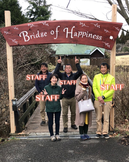 ・ 幸せの橋に看板を設置した直後に、 この幸せの橋を1番に渡る幸運なお客様がご来園。 記念にスタッフと一緒に、記念撮影させていただきました。 大変嬉しいことに、長年くじゅう花公園のファンだとか。 ↓ ↓ ・ その後、ハンギングバスケットの設置をいたしました。 これから大きな鉢にお花を装飾したら幸せの橋が完成です!! この春人気の撮影スポットになるかもしれませんね。 ・