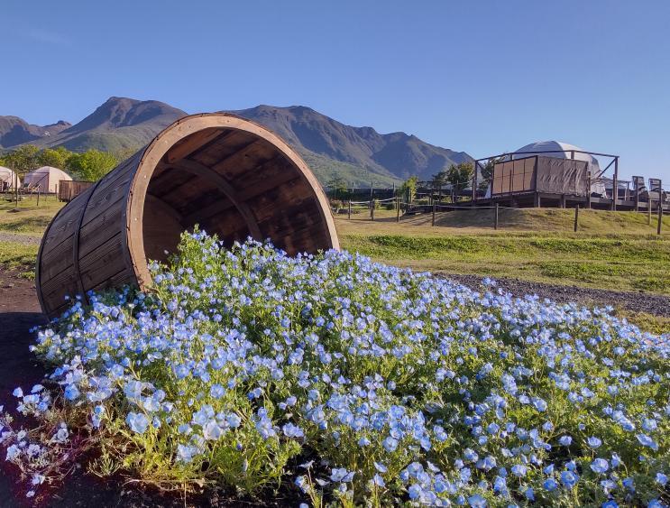 ネモフィラ畑には樽から水が流れでるような、