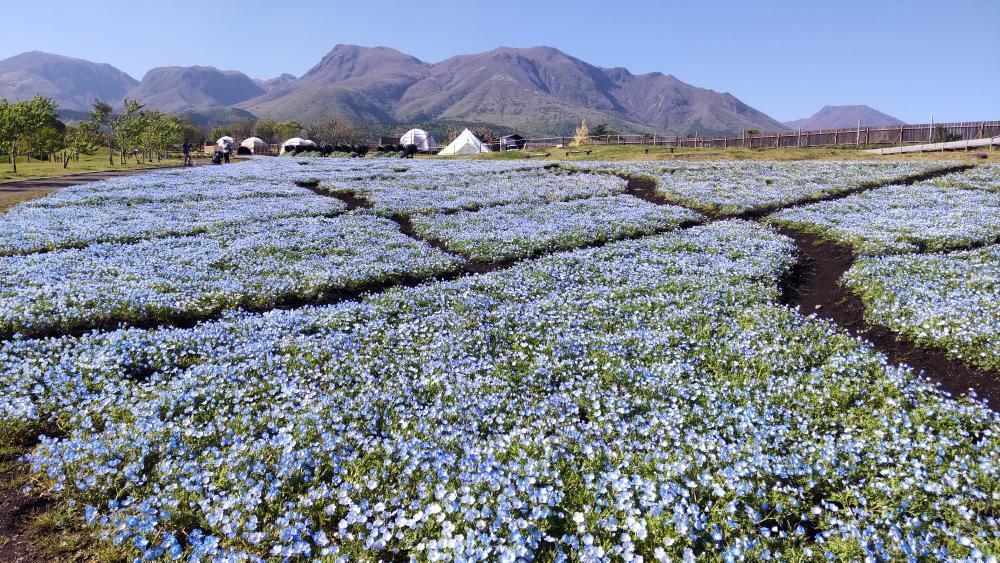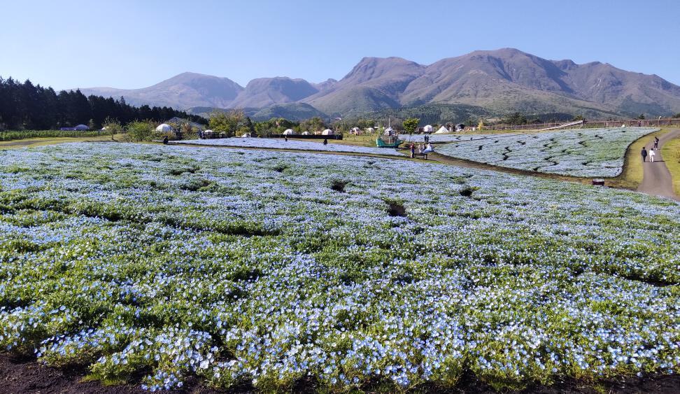 ・ ネモフィラフェスティバル開催中** くじゅう花公園 史上最大面積 9000㎡ 7万株のネモフィラが登場!! 花言葉: 可 憐 / 英名: ベイビーブルーアイズ 赤ちゃんの澄んだ瞳のように一面清らかで、 澄んだブルーの花畑が広がります。 ↓ ↓