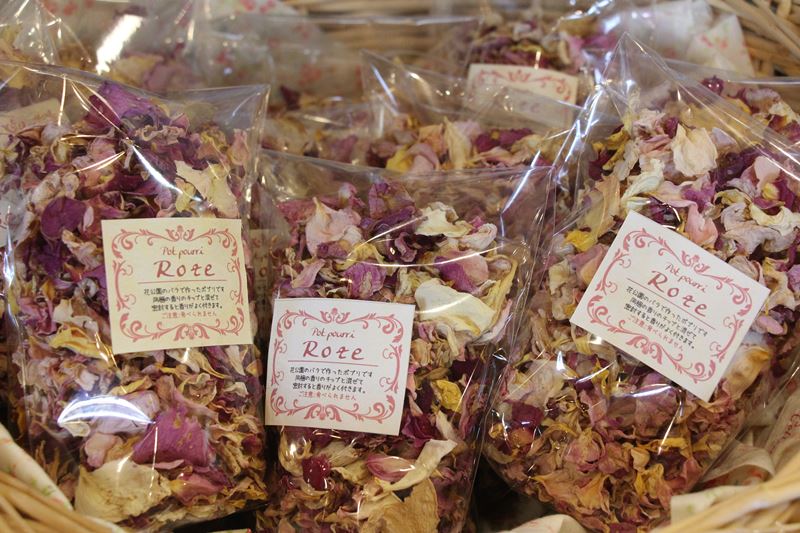 園内で取れたバラをポプリにした、ローズポプリが人気です** ドライフラワーと雑貨のお店「ローズドメイ」にて販売中。 自然なバラの香りを楽しみませんか。 ポプリはお気に入り容器に入れて、楽しむのがおすすめです。