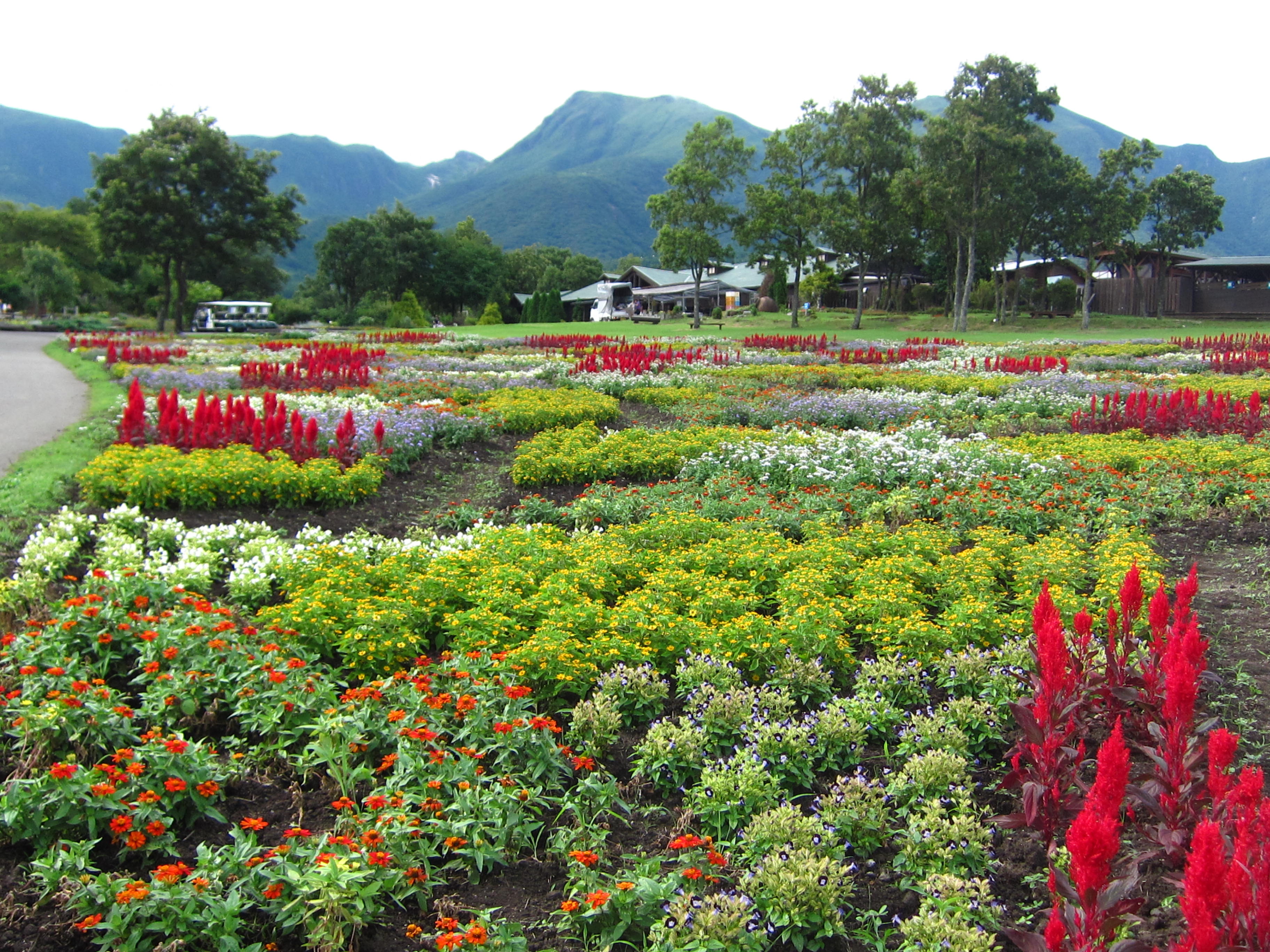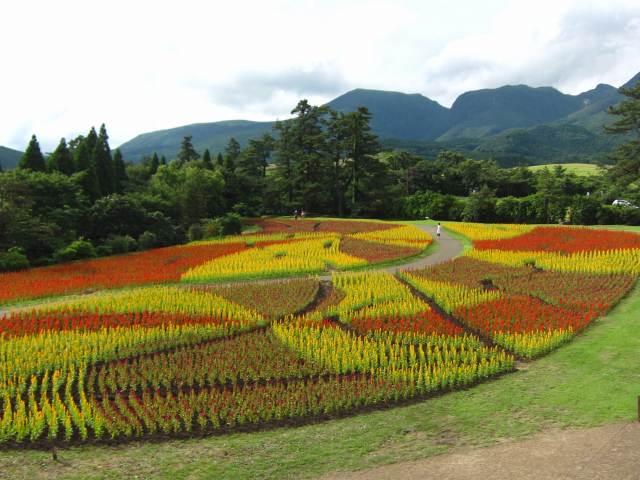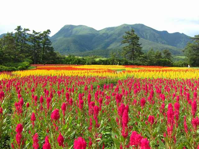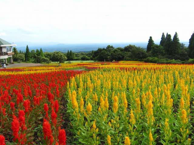 今日は涼しい一日で日陰ではなんと24.7度でした!! レストランから見たケイトウのお花畑↓↓ 下から見上げたケイトウのお花畑↓↓ 上から見下ろしたケイトウのお花畑↓↓ 角度を変えて見ると色々な表情をします。 皆さまぜひ色々な角度からお花畑をお楽しみ下さい。 他にも夏のお花の寄せ植え畑も今見頃で↓↓ 阿蘇方面をバックの写真↓↓ くじゅう連山をバックにした写真↓↓