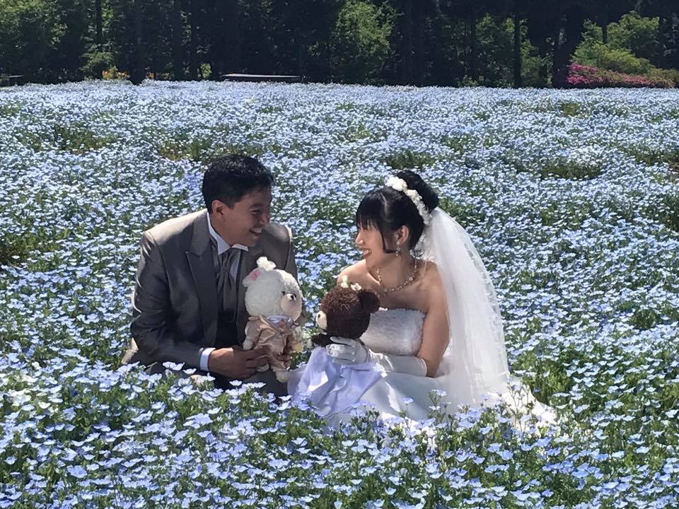 10万株のネモフィラに囲まれた幸せそうなおふたりです。↓ ↓