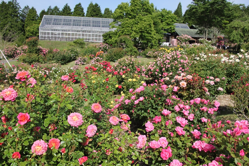 ローズガーデンのバラが見頃を迎えました** まさに今がバラのベストシーズンです。 350種1500株のバラをお楽しみください。