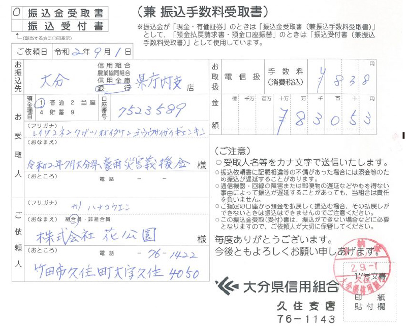7/12より受付及び園内各ショップにて実施しておりました。 令和2年7月大分県豪雨災害義援金 募金活動 のご報告です。 ¥83,053 - の義援金をお預かり致しましたので、 令和2年7月豪雨災害緊急支援様へ送金致しました。 (募金活動は令和2年8月31日にて、一旦終了とさせて頂きます。)