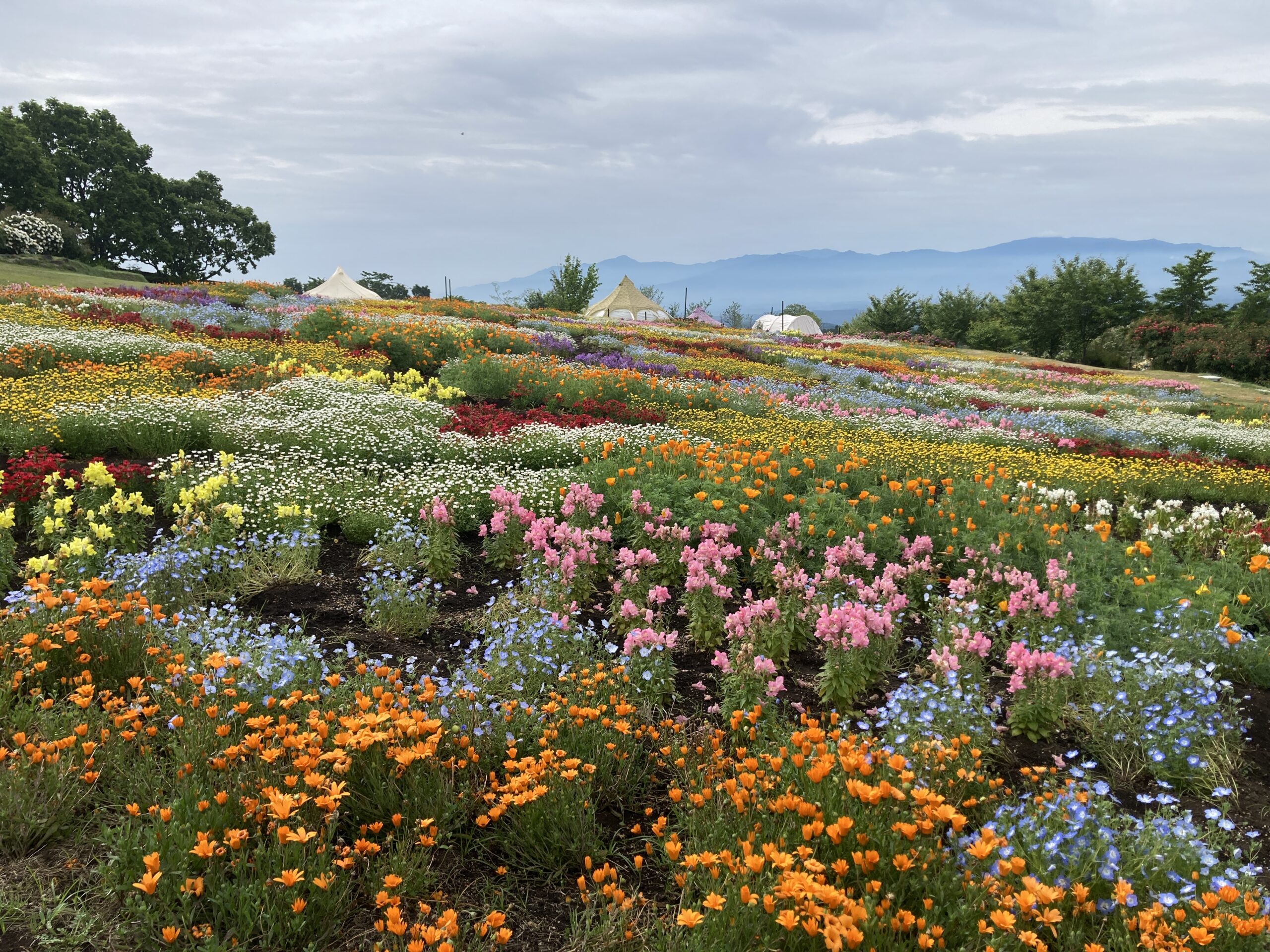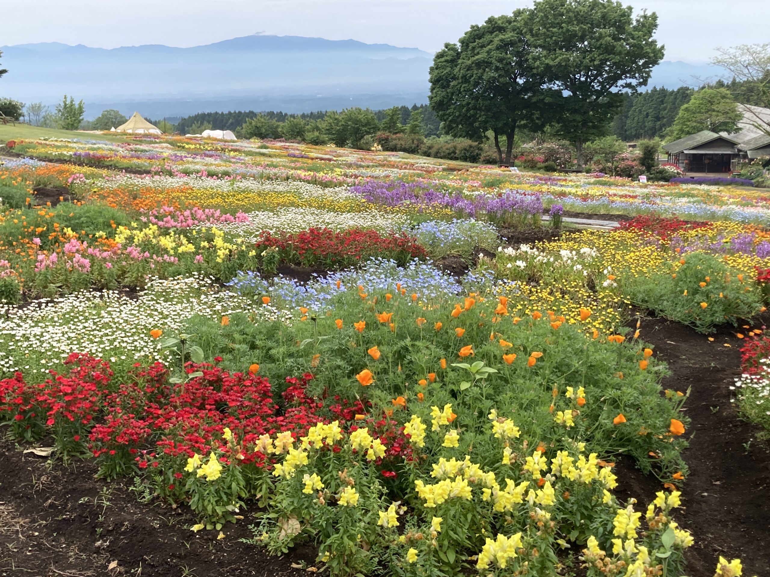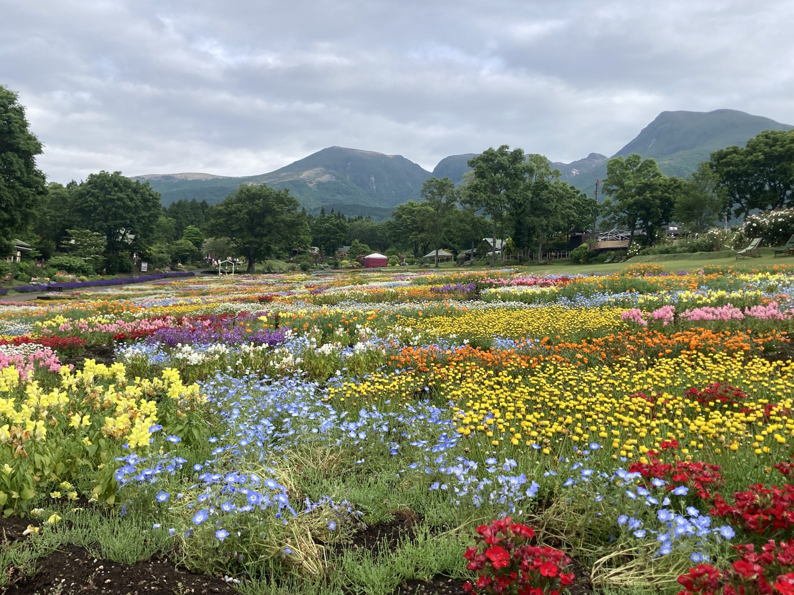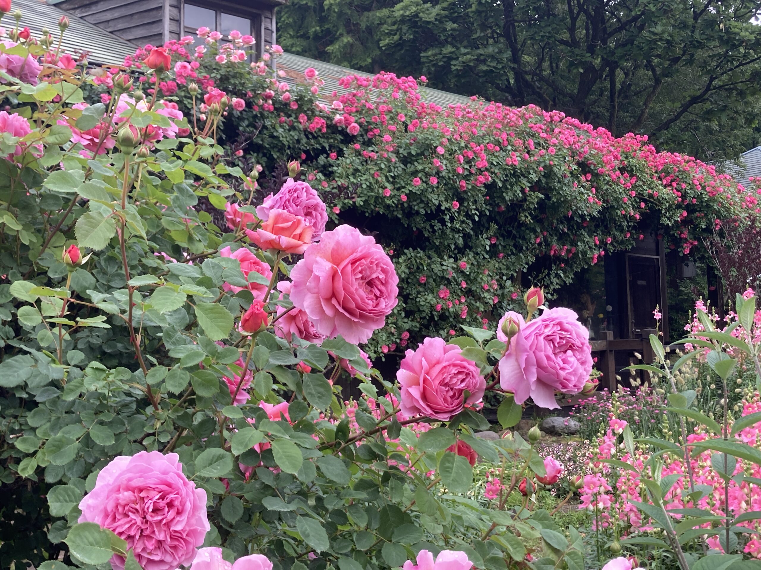 雨、風にやられまもなく終了かと思われた春彩の畑。 園芸スタッフのガラ摘みや傷んだ花の撤去など地道な作業のおかげで 黄色のムルチコーレや紫のリナリアなどが回復 まだまだ綺麗に見ていただけるようになりました! くじゅうガーデンの人気エリアピンクのガーデンではつるバラが見頃です。 写真スポットも豊富なくじゅうガーデン、是非お立ち寄りください。