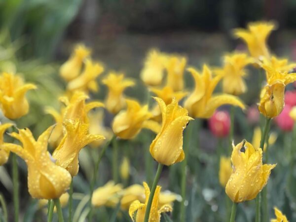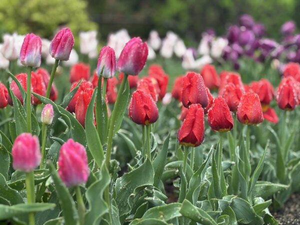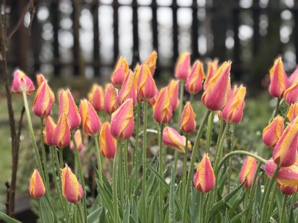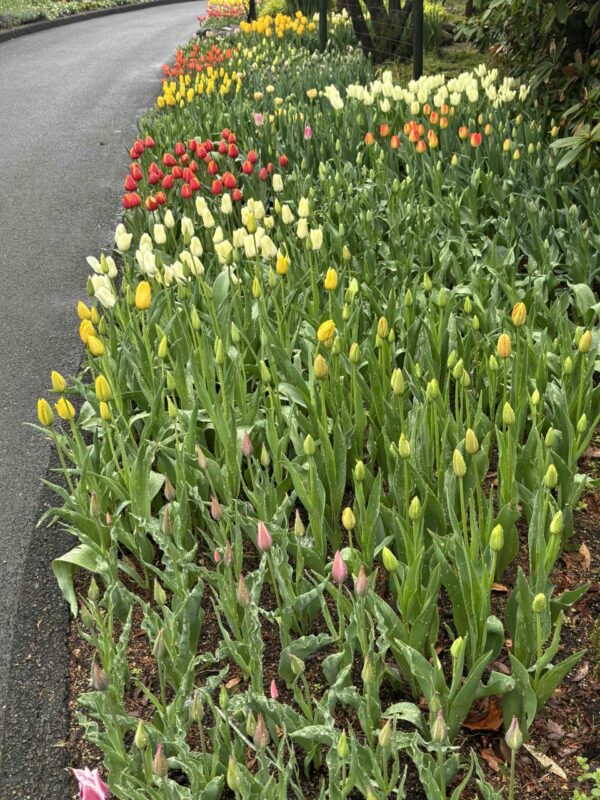 例年通り、黄色が先行して開花、赤→白→オレンジ→ピンクの順番で咲きそろいます。