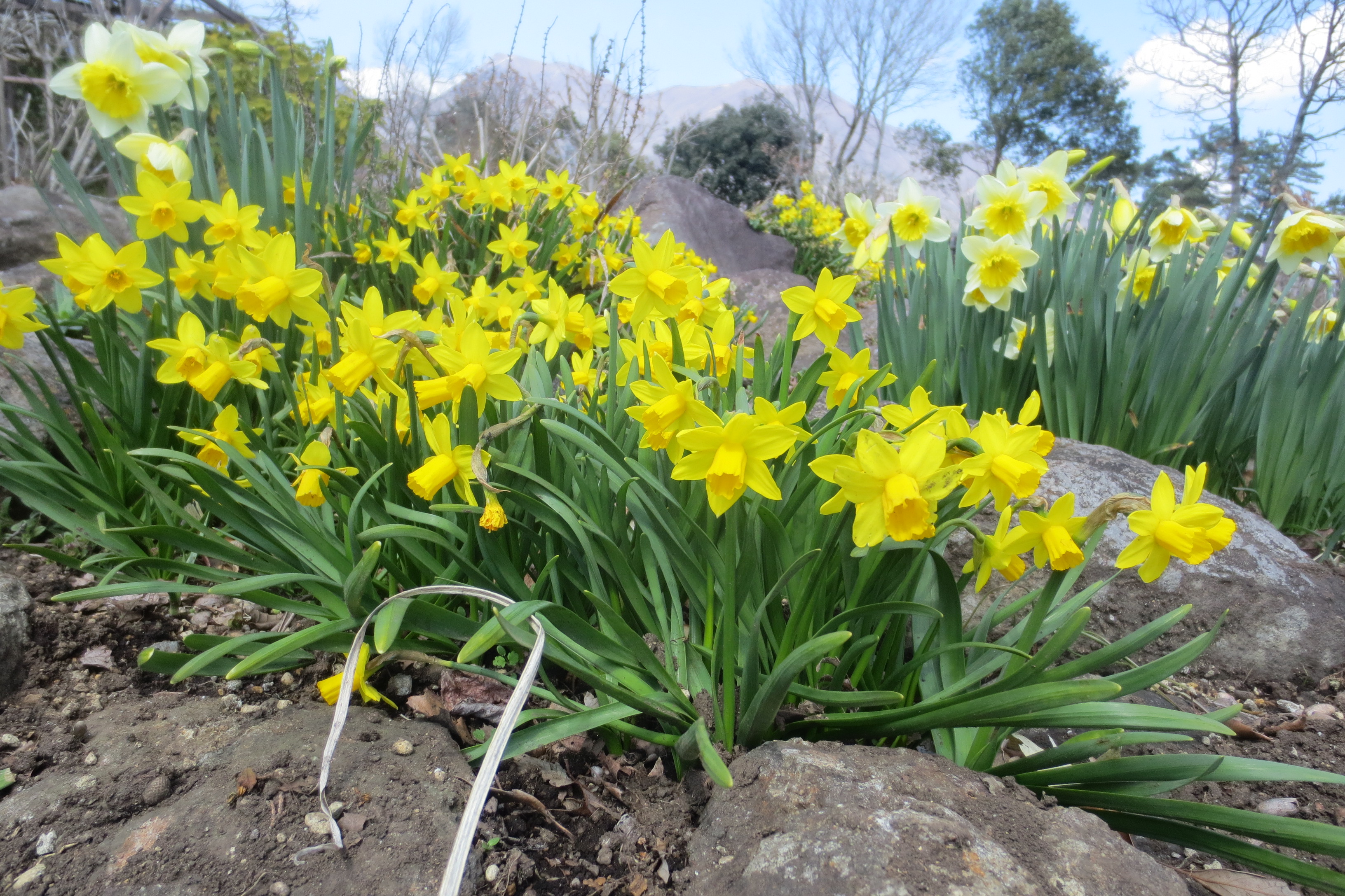 ・ 良い天気となりました♪ 春の暖かい日差しと、心地よい風が久住高原を通り抜けていきます。 ほのかな香りで春の訪れをお知らせしてくれるお花。 スイセンが園内各所で咲き始めました。 目を引く美しい色と、香りに誘われて園内散策してみませんか。↓ ↓ ・
