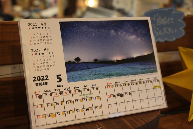 久住高原星空の巡りより、 月の欠け満ちが分かる 卓上カレンダーの販売スタートとなりました。 流星群や星空の巡りイベント開催日が分かる カレンダーとなっております。 お買い求めは温室アンティルまで。 ・ 夜の園内の花畑と星の写真が、 1年間机の上を輝かせてくれます**