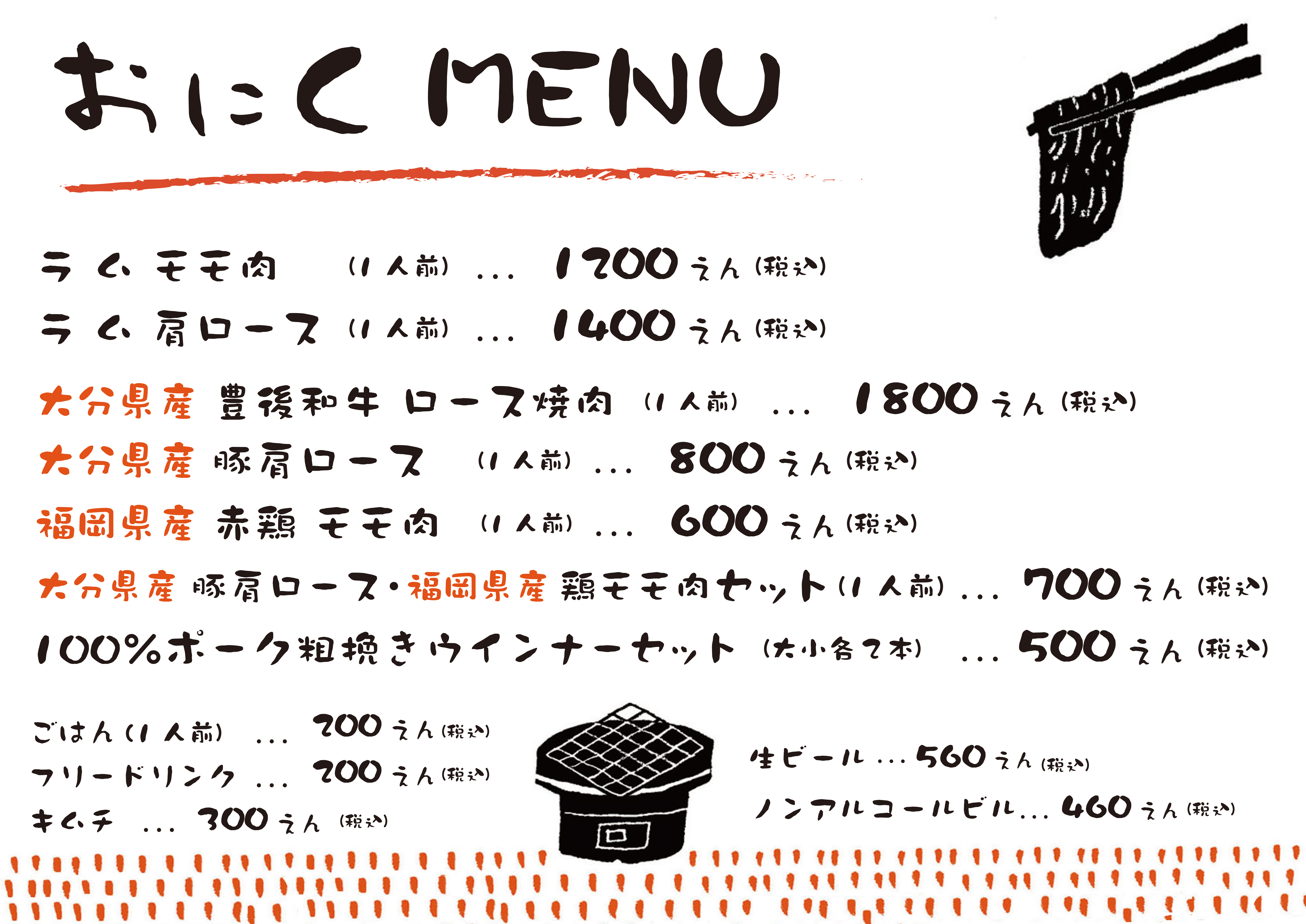 4/18(土)より、ジンギスカン北海道 M E N U リニューアルいたします。 am 11:00 ~ pm 15:00 ( LO 14:30 ) 大分県へ来たら地元の美味しいものはいかがですか。 標高850mの久住高原で焼肉は最高です♪** 大分県産豊後和牛ロース焼肉は、 A-4等級以上の大分100年の恵みブランドを使用。 大分県産 豚肩ロースは奥豊後豚を使用。 ぜひ、お立ち寄りください。 ・