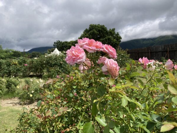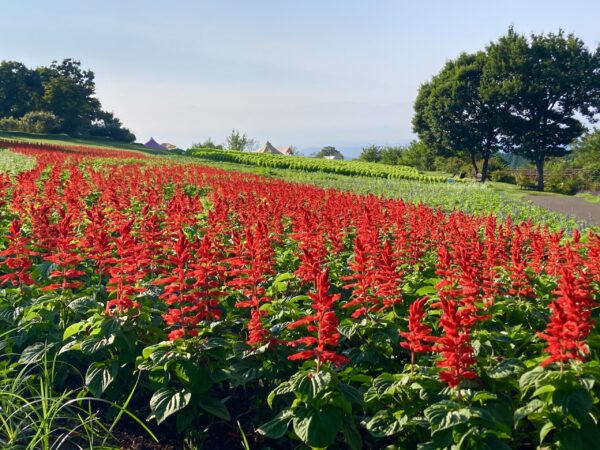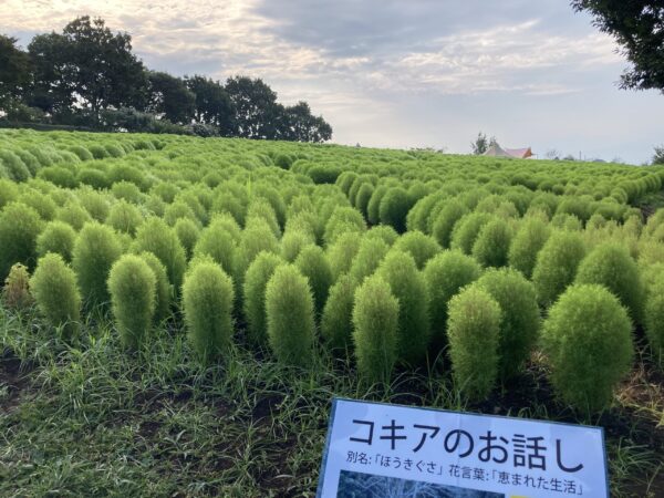 ひまわりが終わりを迎えました。 温室内ではサンパチェンスの鉢植えが花を上げはじめました。 写真スポットもあります。ご来園の際はお立ち寄りください。 天候に恵まれコキアもグングン成長中!入園ゲートをくぐって左側で見頃です。 コキアの畑の上には赤のサルビアがキレイです。スタッフが毎日草取りに追われています。 ローズガーデンの夏バラも終盤ですが、まだまだ綺麗に咲いているバラもあります。