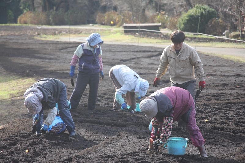冬期休園中のくじゅう花公園では、春に向けて様々な管理を行っております。 今日は毎年恒例のチューリップの球根の植付け作業をでした。 その数約1万3千球の球根を手作業で進めていきます。今日は植付けメンバーが集まり、とても賑やかな植付け作業でした。