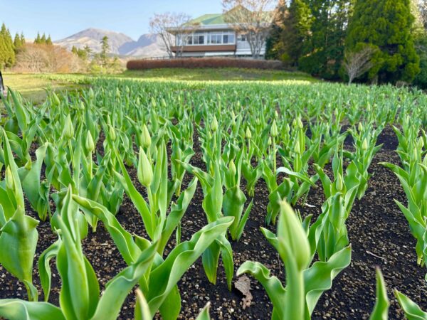 大きな畑のチューリップはまだ蕾が出てきて膨らみ始めています。 まもなく開花が始まりそうです。 成長が早くつぼみの部分が伸びふっくらとしてきました! 今週末頃から開花が始まりそうです。 くじゅうガーデンのチューリップは見頃の品種が日々増えています。 原種チューリップは満開!
