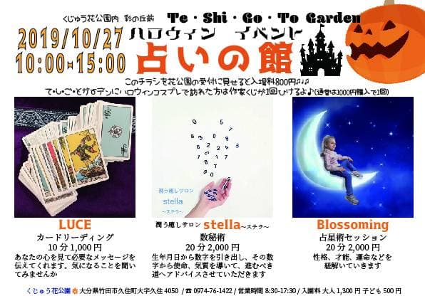 ・ 30人の作家紡ぐ癒しのハンドメイド雑貨店 「てしごとガーデン」より、お知らせです。 ハロウィン特別イベント占いの館 2019/10/27 10:00-15:00 カードリーディング 10分 1,000円 数秘術 20分 2,000円 占星術セッション 20分 2,000円 Te・Shi・Go・To Garden インスタグラムはコチラ