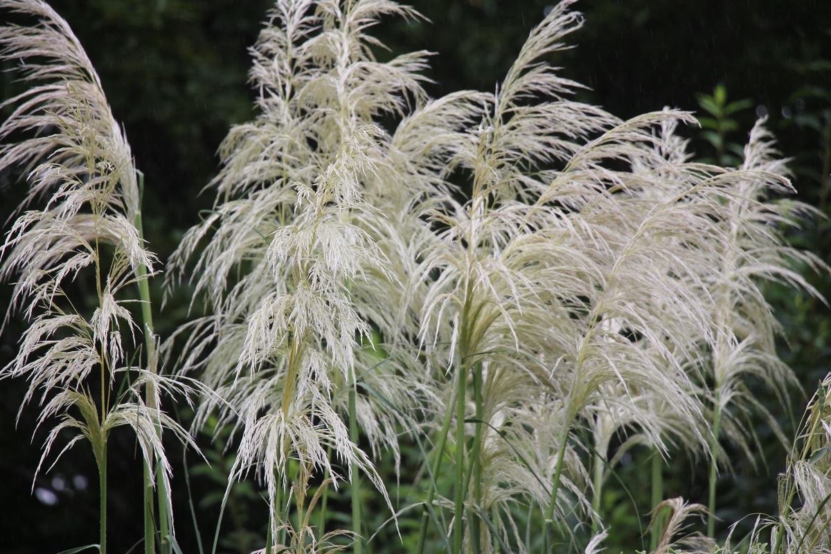 パンパスグラスが咲き、秋の気配を感じるようになりました。 和名ではシロガネヨシといいます。 近年ではドライフラワーとしてとても人気です。 ガーデンのアクセントにもなり、とても存在感があります。 園内の久住ガーデンで見ることができます。
