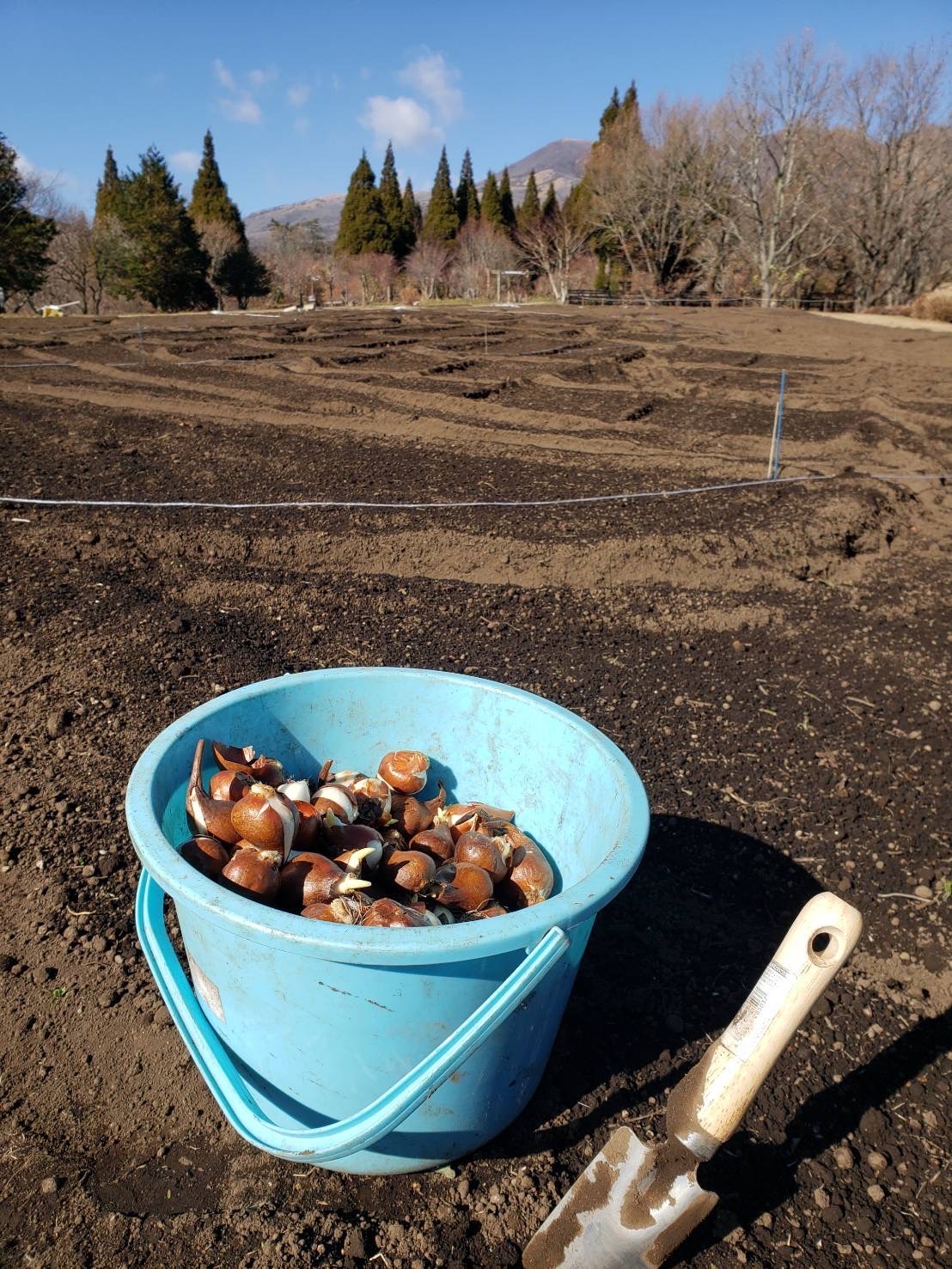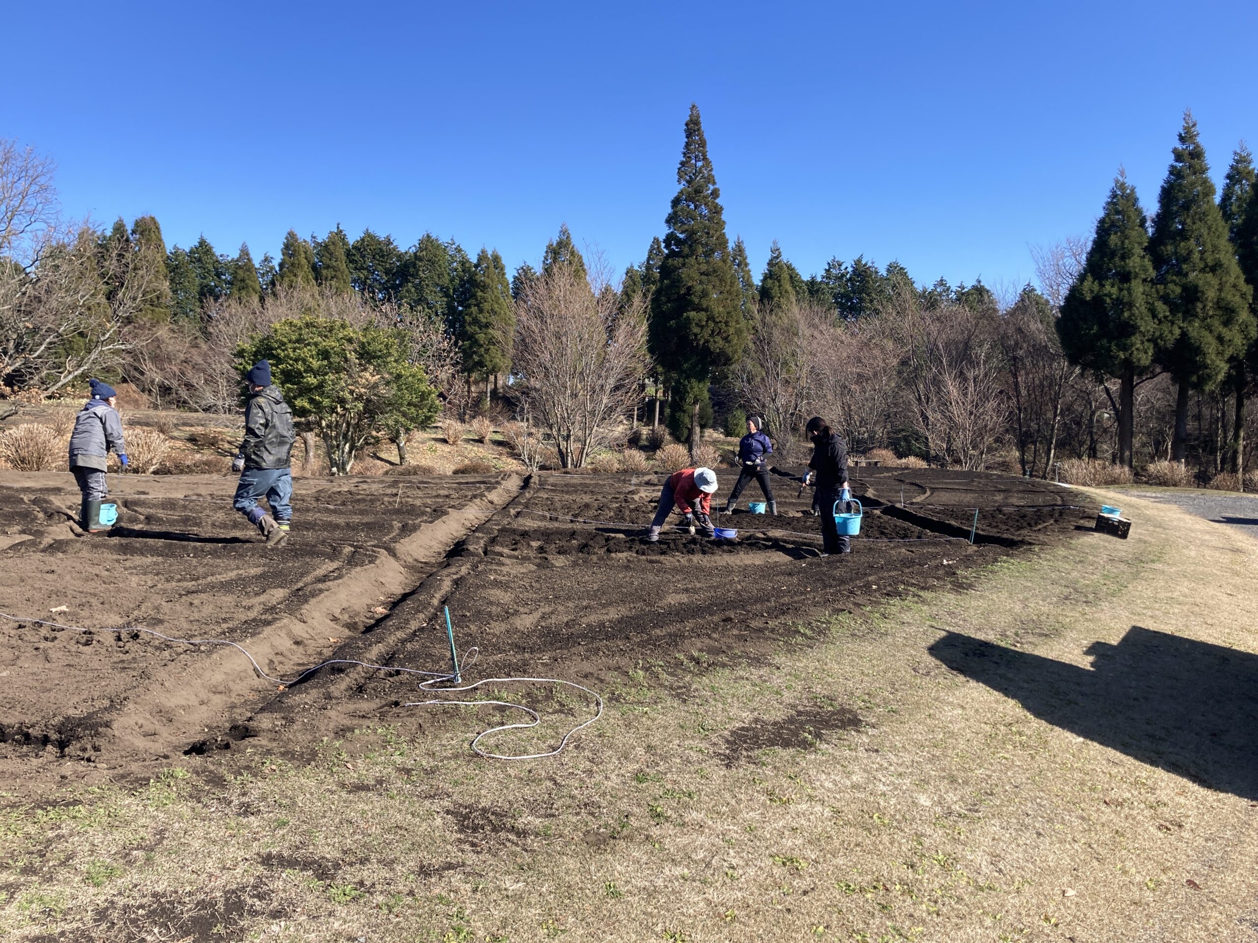冬期休園中のくじゅう花公園では、春に向けて様々な管理を行っております。 今日は毎年恒例のチューリップの球根の植付け作業をでした。 今年は昨年より多い約2万球の球根を手作業で進めていきます。 色が混ざらないようにバケツに球根を入れて植えて行きます。 ロープを張ってデザインを行っています。 植付メンバーがワイワイ楽しく作業をしています。 植付けスピードが速く丁寧な事に驚きます。