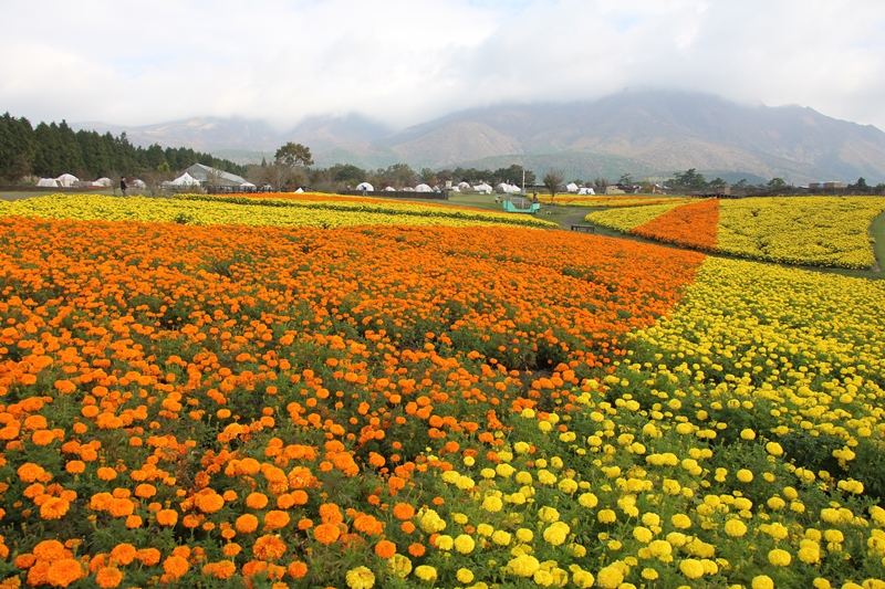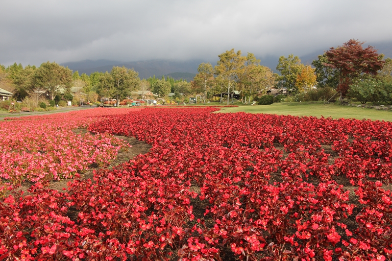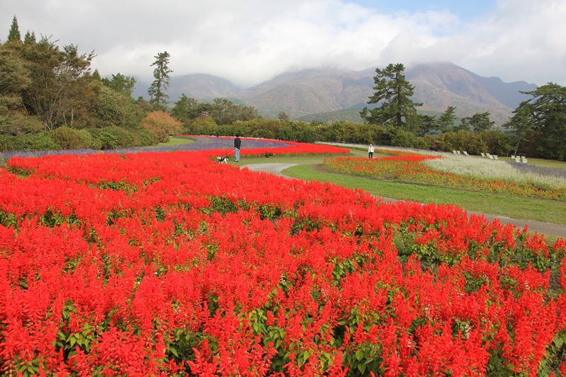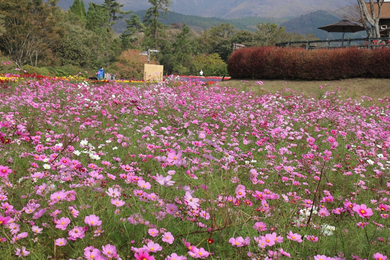 早朝はくじゅう連山に雲がかかっていましたが、 お昼前には青空に変わりました。 青空が広がる前の早朝の園内の様子です。 コスモスが見頃となりました。 台風の影響がありますが、綺麗に咲いています。