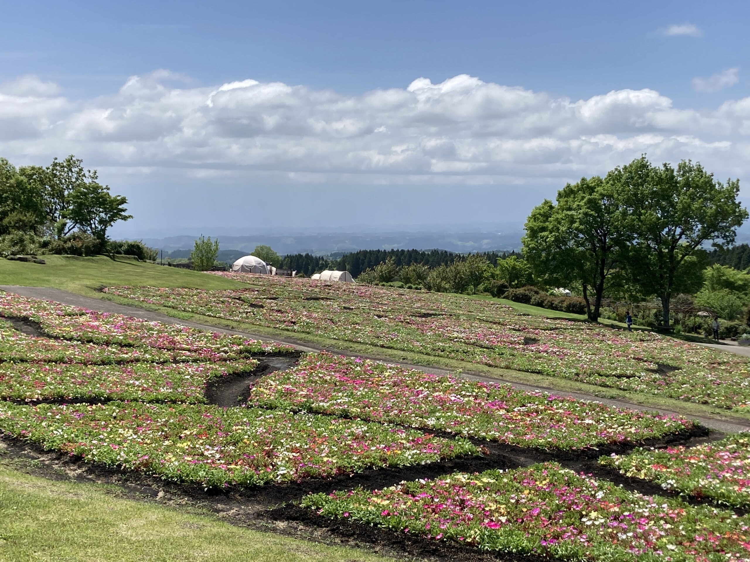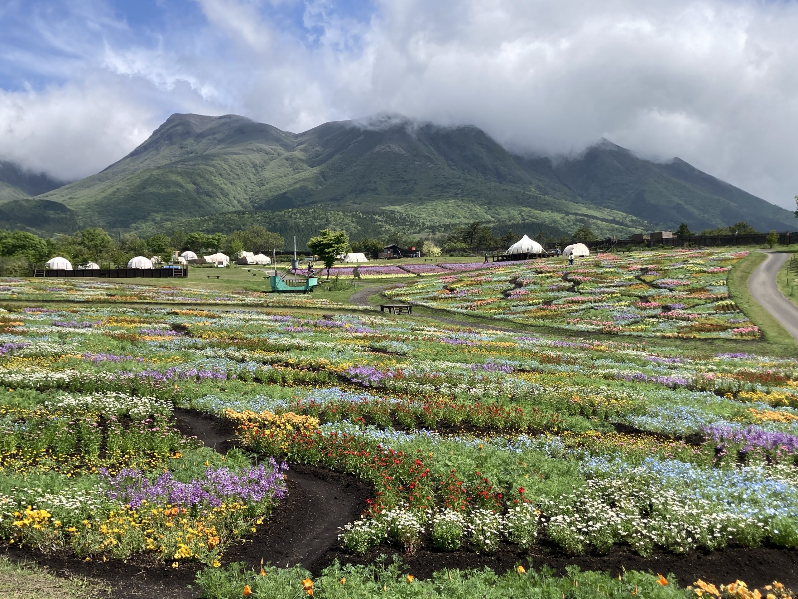 春彩の畑は5分咲きですが少しずつ色鮮やかになりつつあります。 青空とくじゅう連山を背景に綺麗な花畑になるでしょう!
