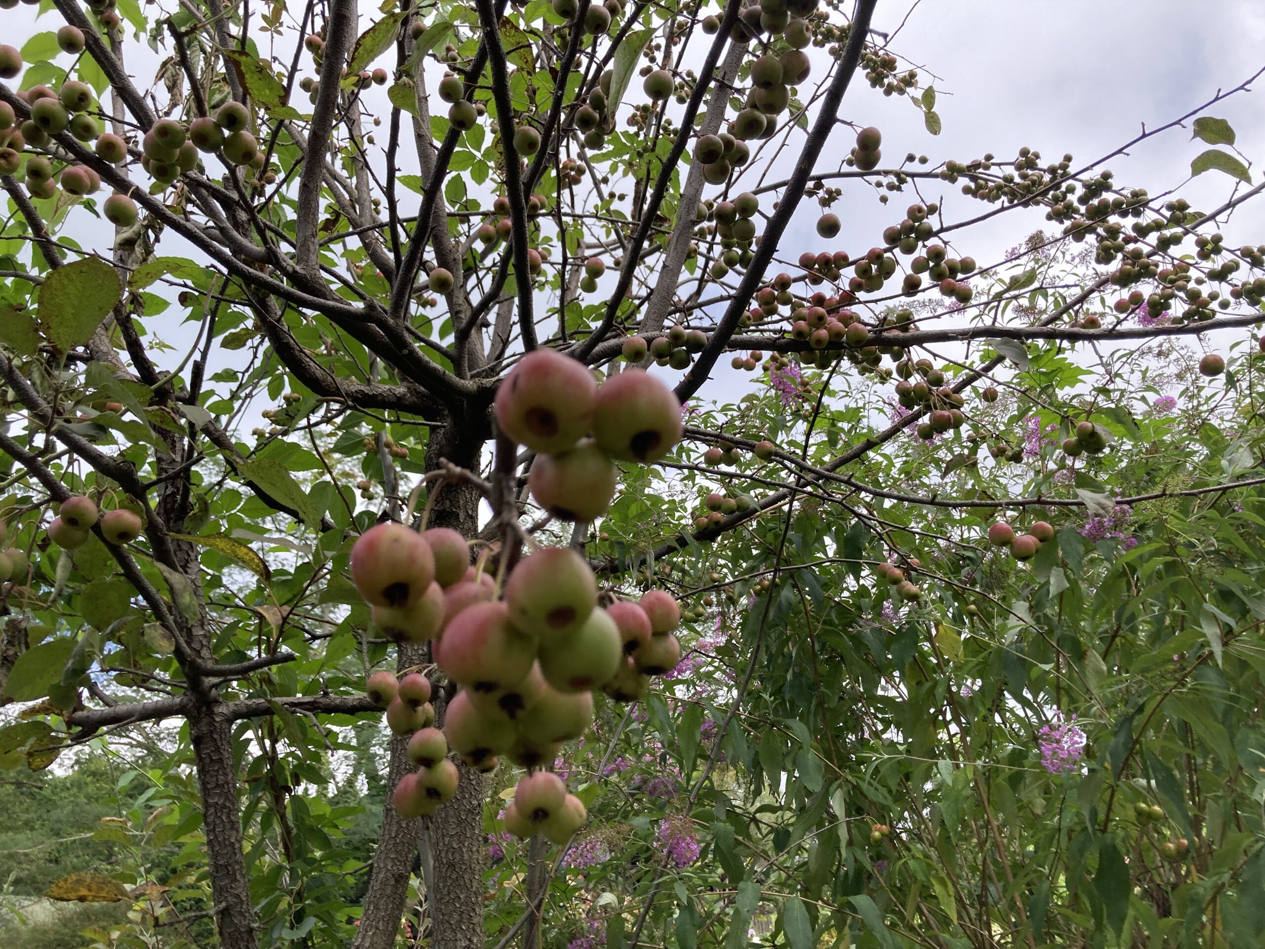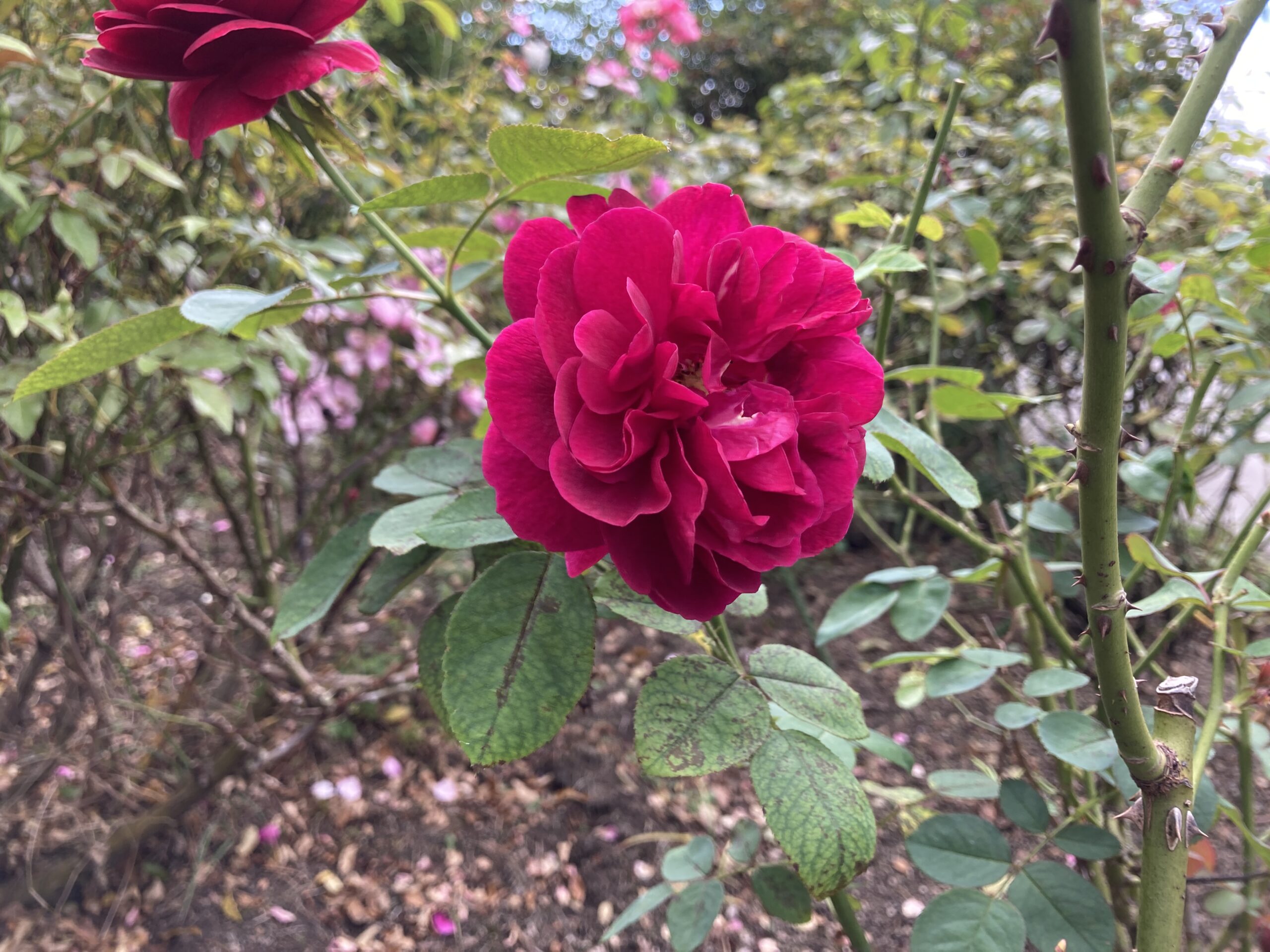 ローズガーデンでは秋バラが少しづつ咲き始めました! まだまだ少な目ですが、秋バラ特有の濃い色の花が増えています。 ローズガーデン内にあるサンザシもたくさんの実をつけています。 サンザシも一応バラ科の樹木です。