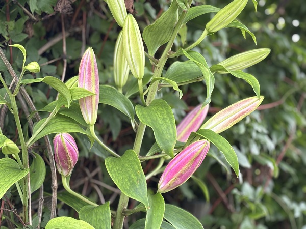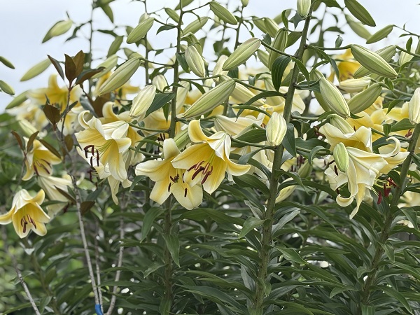 入園ゲートを入って左手にある「彩りの丘」の上にある 白バラのエリア内でオリエンタルリリーが咲いています。
