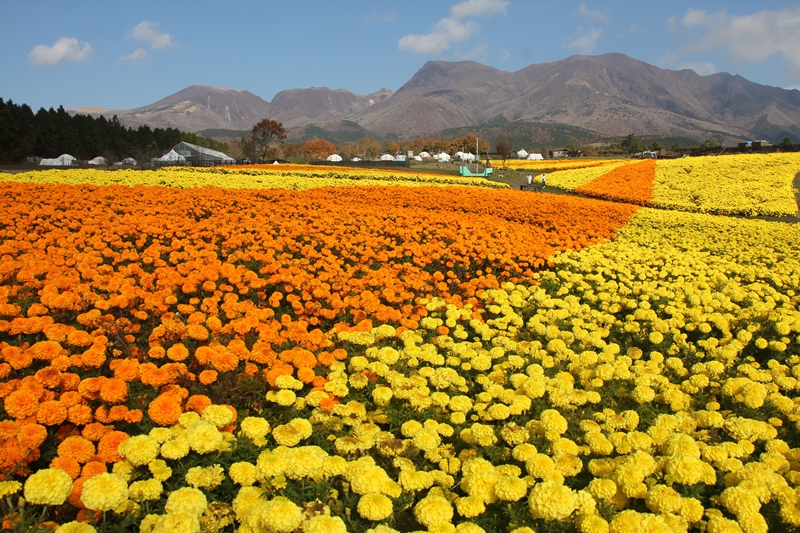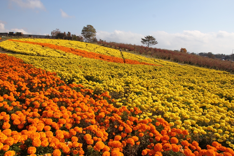 天候に恵まれ引き続き、見頃継続中となっております。 マリーゴールドが綺麗ですよ!! . 広さは9,000㎡・その数約7万株のマリーゴールド 品種はアフリカンマリーゴールド 直径は8cmほどあり、とても大きなお花です。
