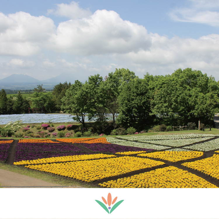 **くじゅう花公園の過去の写真をお届け** カラフルで印象的なビオラと空のように青いネモフィラ。 さらに、遠くに眺望できるのが阿蘇五岳。 春になったら、お気に入りの景色を探しに出かけませんか? ビオラ 開花期間:4月中旬~5月上旬/ネモフィラ 開花期間:5月上旬~5月下旬