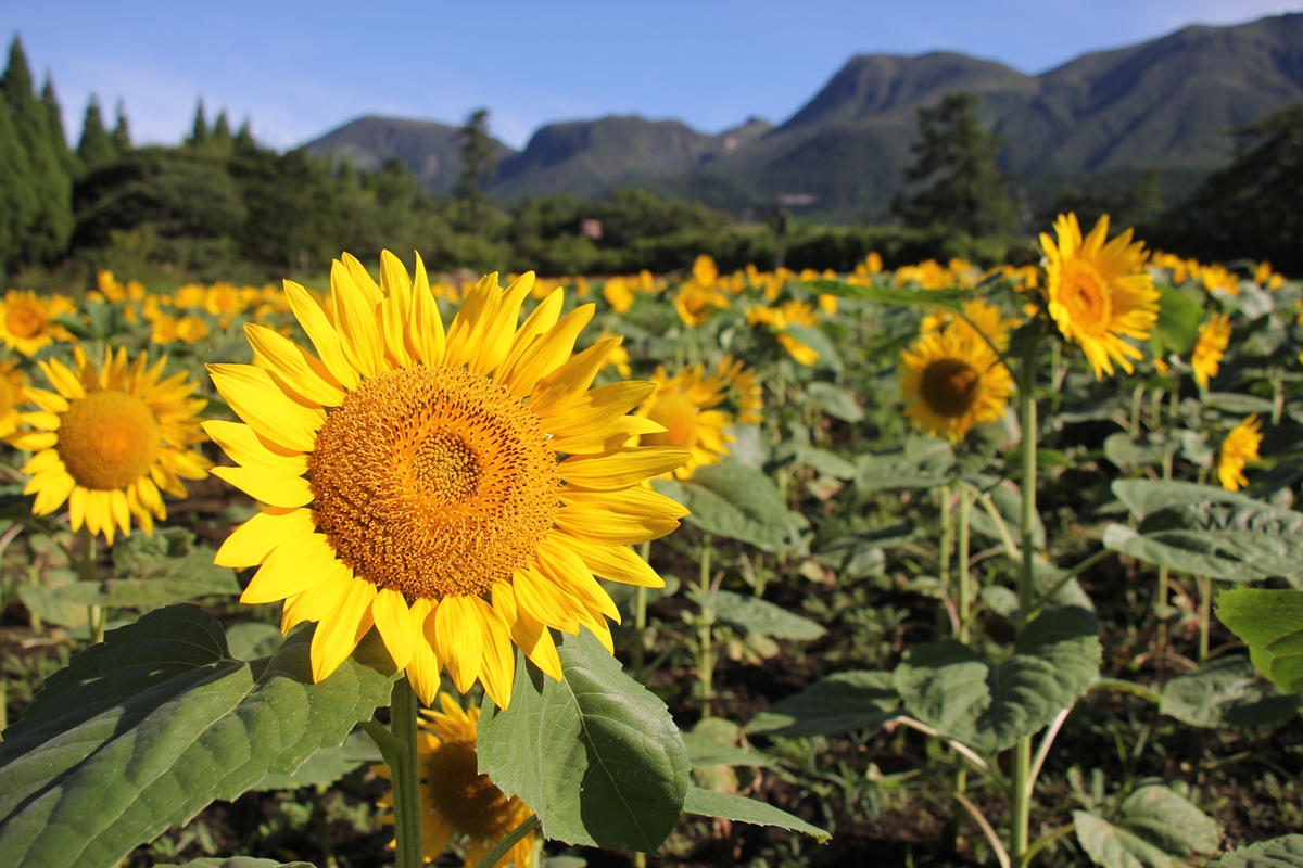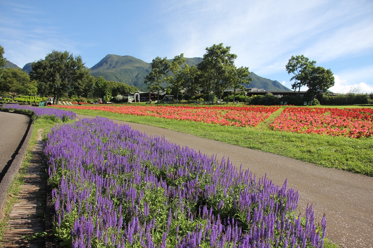 手前の宿根サルビアと赤と桃色のビックベゴニアが青空に映えて綺麗です。