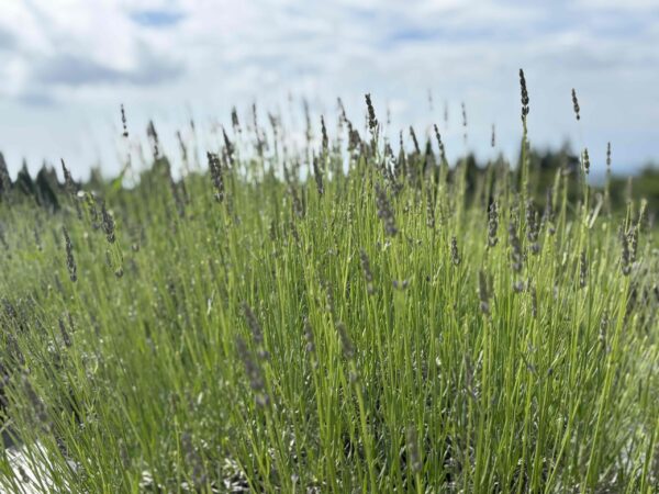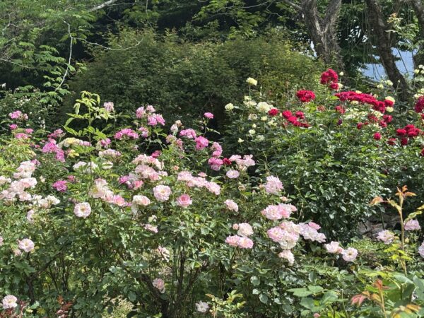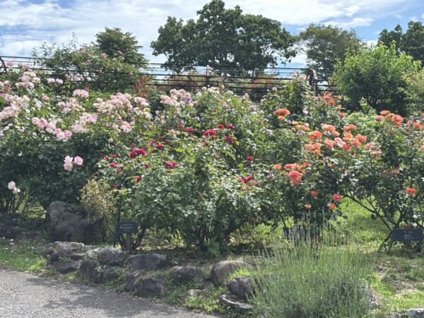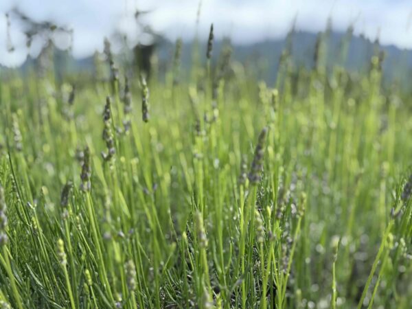 6/21現在のラベンダーの開花状況 薄らと色づき始めました。 6月末くらいから見頃、摘み頃の予想になります。 全体的にはまだ青い状態です。 近づくと薄らと色がついています。 ローズガーデンは、花数は少なくなっていますが香りや花をお楽しみ頂けます。