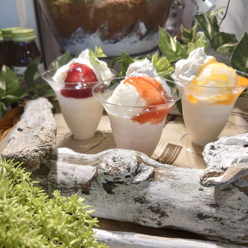 ●ムースパフェ 各種500円 なめらかムースに吉井牧場より直送したアイスクリームと ホイップクリームをのせて ほんのり甘い果肉ソースをトッピングしました。