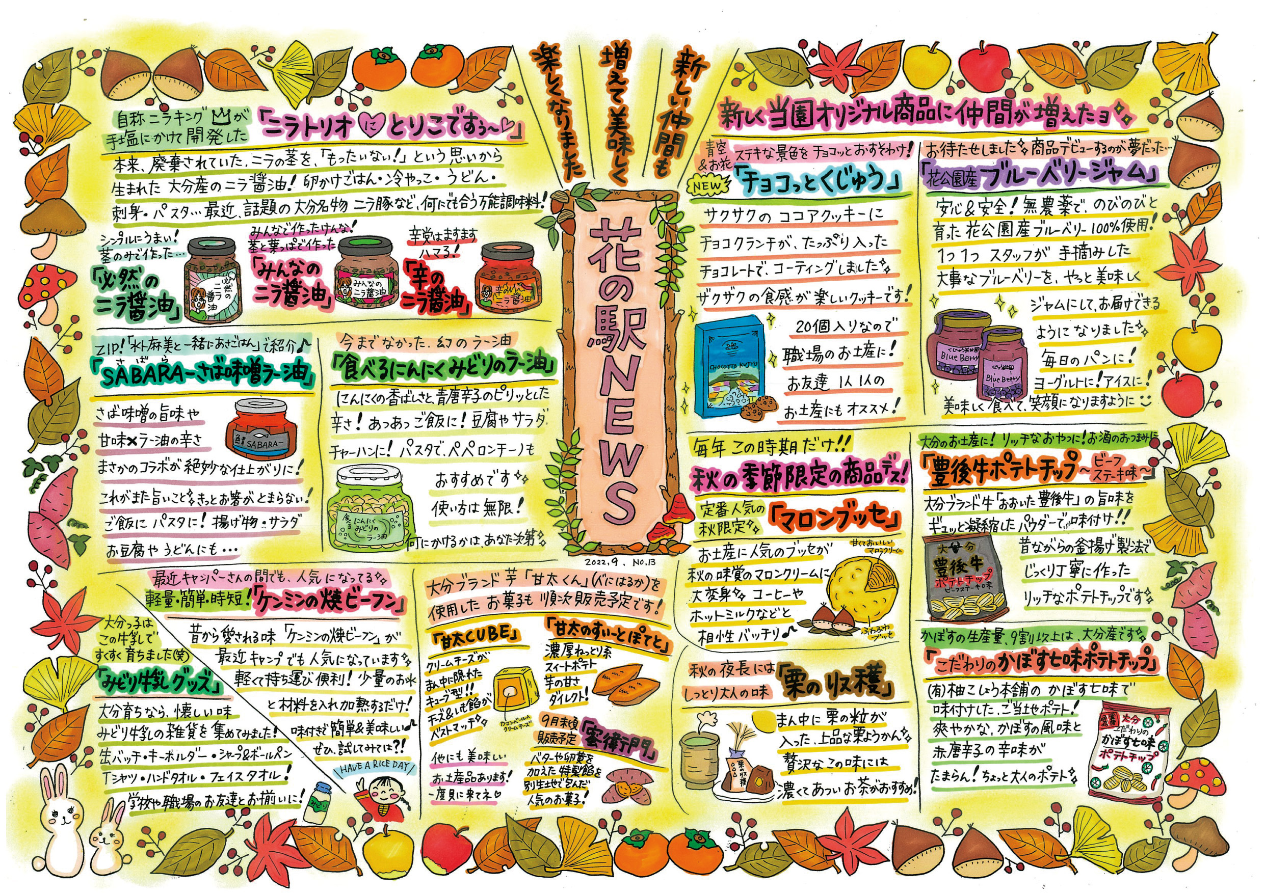 標高850mのお土産ショップ「花の駅」からのお知らせ!! くじゅう花公園オリジナル商品や秋の季節限定商品 地元大分県産商品など新しい商品が増えました。 是非、「花の駅」へお立ち寄りください。 ▼ 画像をクリックして拡大