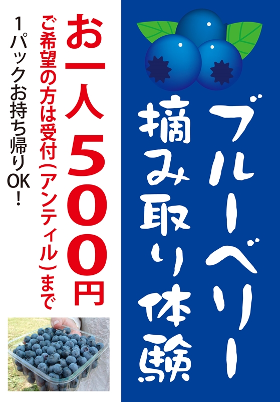 予約不要・ブルーベリー摘み取り体験スタート!! 久住高原の恵みブルーベリーの季節となりました。 11種類・約2000本のブルーベリーが実ります。 体験料金 / おひとり 500円 指定のパックに入るだけ摘み取ることができます。 ※荒天時や台風通過後、一時中止となる場合がございます。