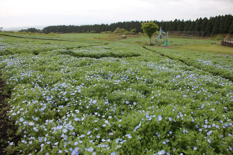 現在、ネモフィラ 咲き始め ・ こちらは全体の様子。 天候回復後、数日天気が続くと見頃を迎えそうです。 4/30(祝)より、ネモフィラフェスティバルを開催。 今後の開花状況はHPにてご確認ください。 ・