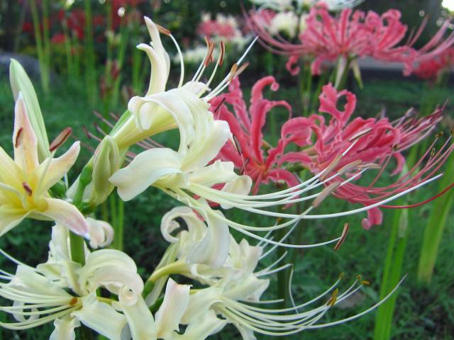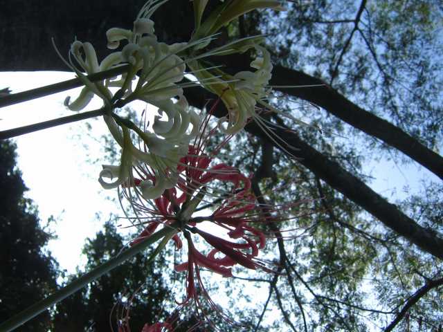 リコリス(彼岸花) が ネムノキに優しく包まれて咲いています。↓↓